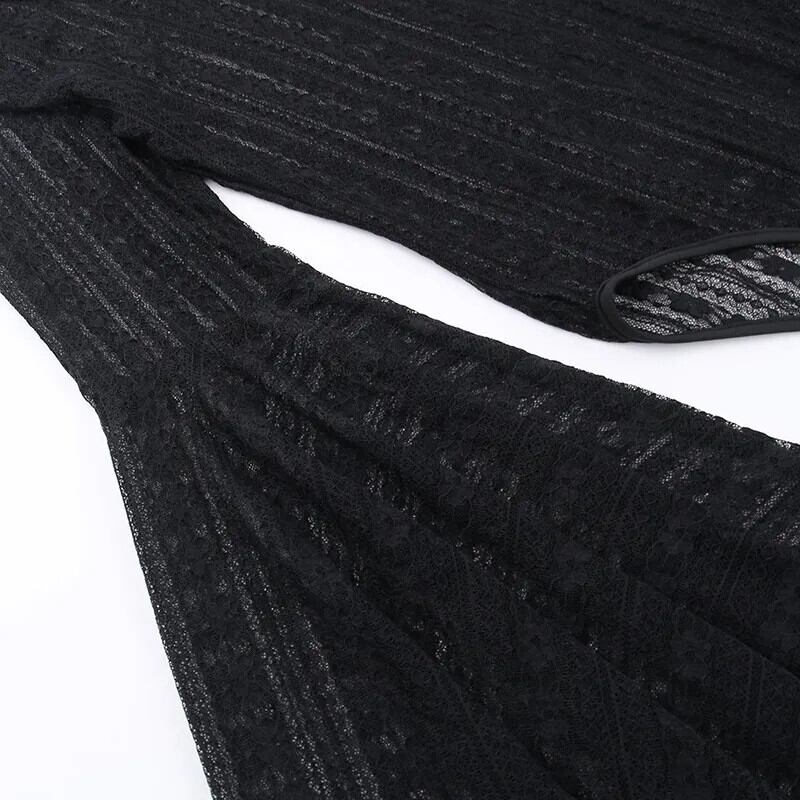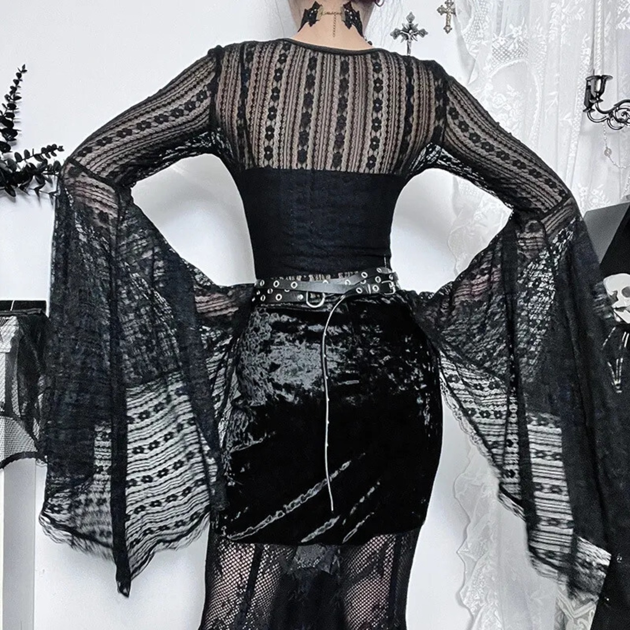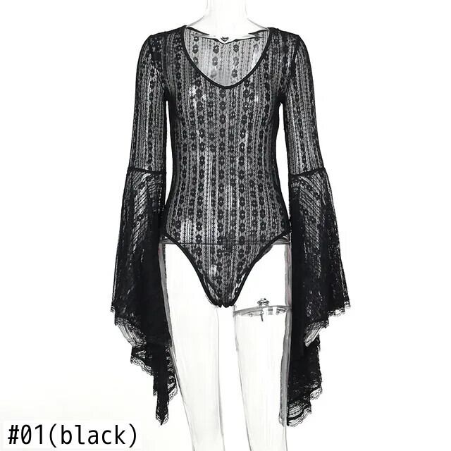 送料無料 ゴスダークレースシースルーモールゴシック美的ボディスーツフレアスリーブグランジセクシーな女性トップスパンクボディコン V ネック Alt ボディスーツ Vネック AE155588763126069053