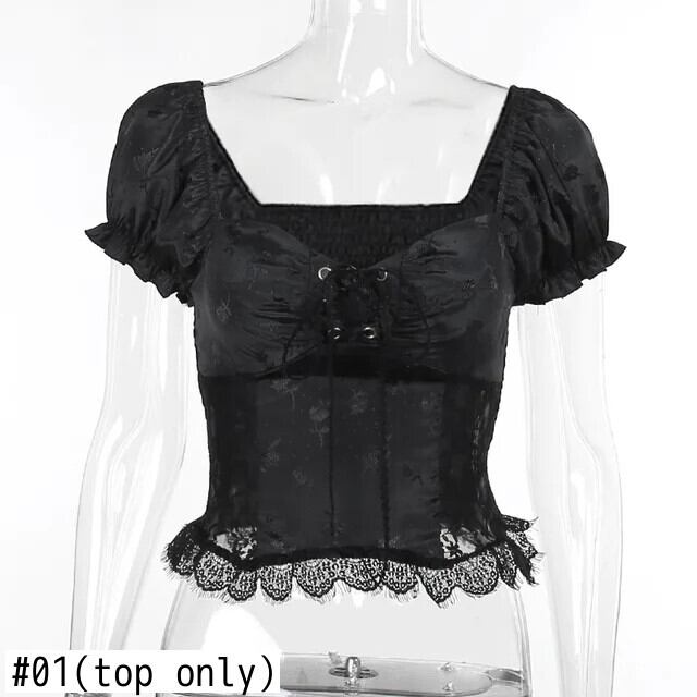 送料無料 ゴスダークビクトリア朝ゴシック女性スカートツーピースセットグランジセクシーなパフスリーブシャーリングブラウスジャカードレーストリムスカート AE155588766722810139 | 女性の為の通販サイト-fashion navi