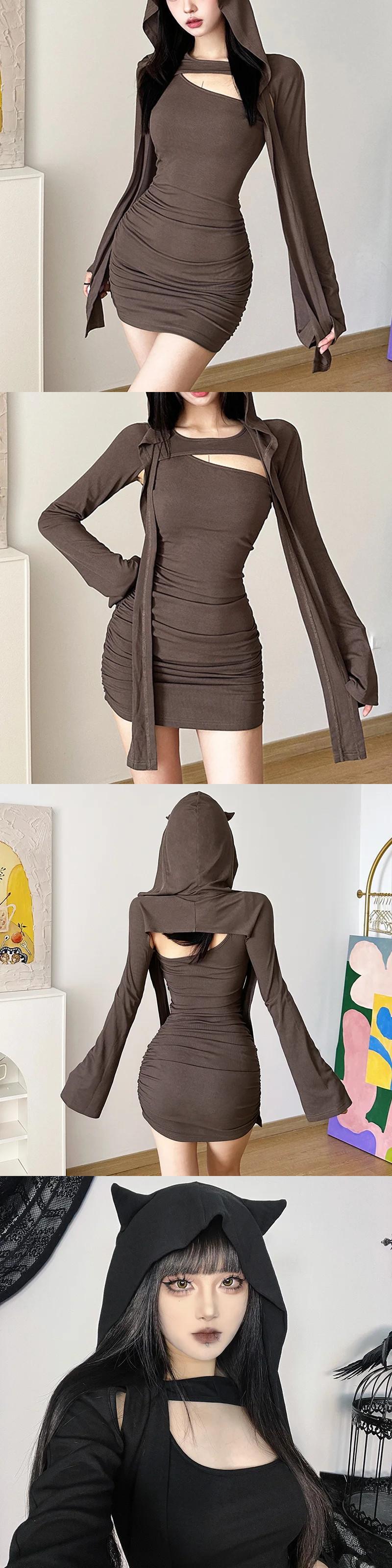 送料無料 ゴスダークサイバー Y2k フード付きデザートウォーカードレス 2 点セットゴシックパンク長袖クロップトップスワンショルダーボディコンミニドレス ロング AE155588715407870975