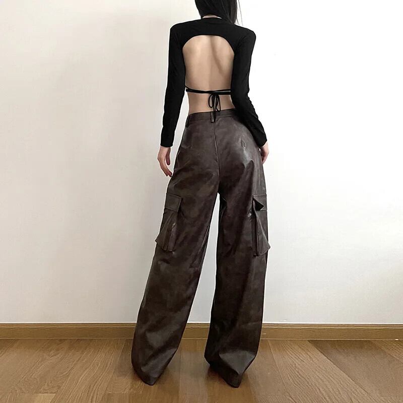 送料無料 ゴスダークフェイクレザー Y2k ストリートカーゴパンツサイバーゴシックパンクウエストだぶだぶのズボン 90 年代グランジヴィンテージボトムス ファー ビンテージ AE155588797440415111