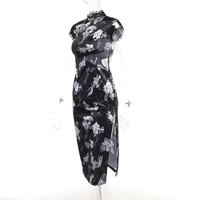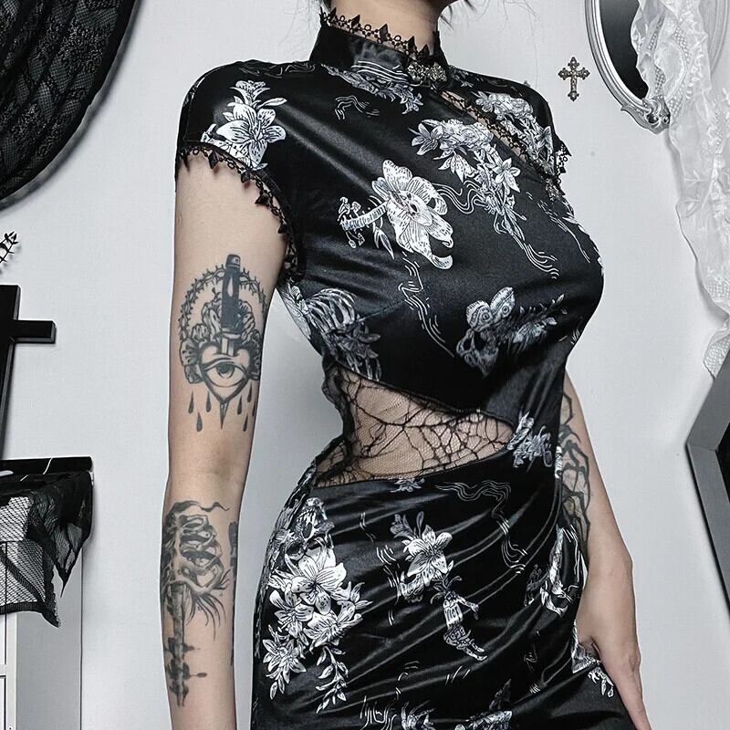 送料無料 ゴスダークスパイダーウェブパッチワークスカルパンクスリムドレスモールゴシックグランジセクシーな女性チャイナドレススプリットナイトオルトパーティーウェア AE155588744599805099