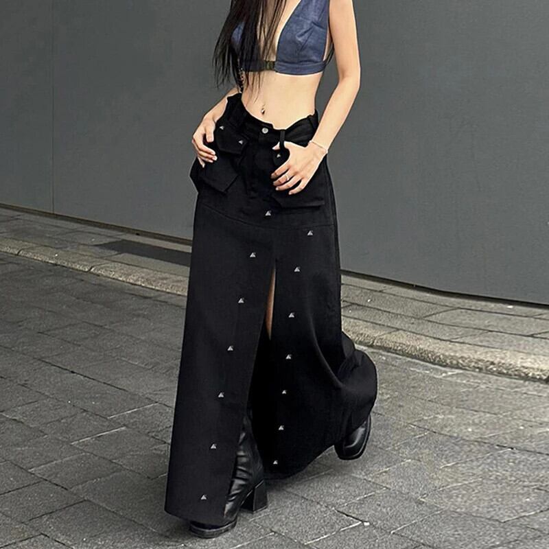 送料無料 ゴスダーク 90 年代グランジストリートリベットマキシスカートサイバーゴシック Techwear Y2k スプリットセクシーなスカートパンクウエスト A ラインロングボトムス Aライン AE155588752370990626