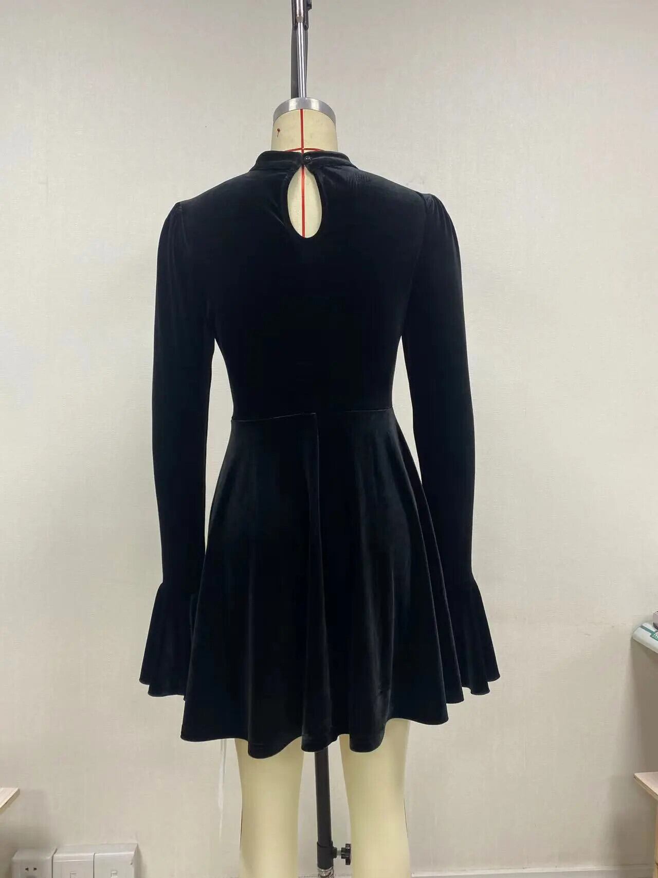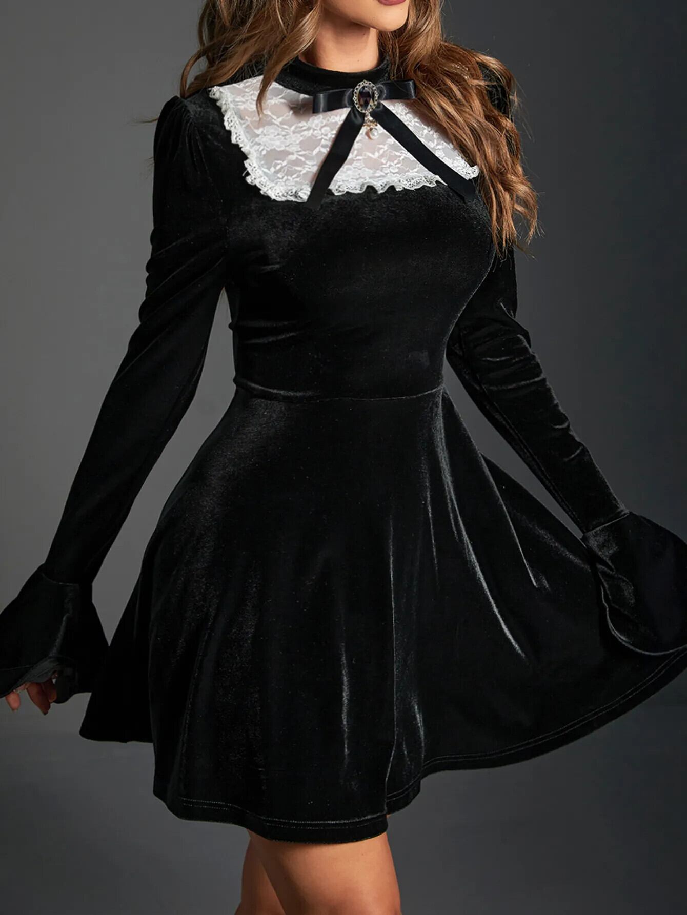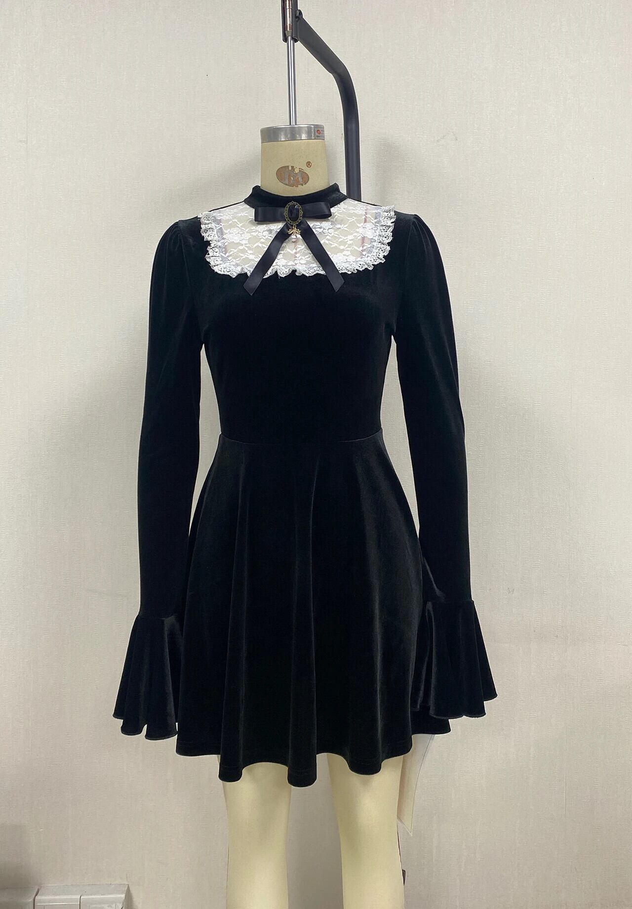 送料無料 ゴスダークロリータゴシック弓レースパッチワークミニドレスメイドベルベット長袖ドレスグランジ A ライン秋の女性の衣装 ロング リボン オータム 秋物 Aライン AE155588780126710742