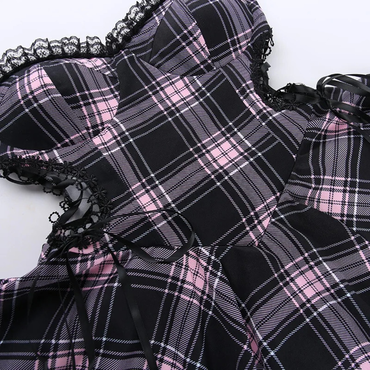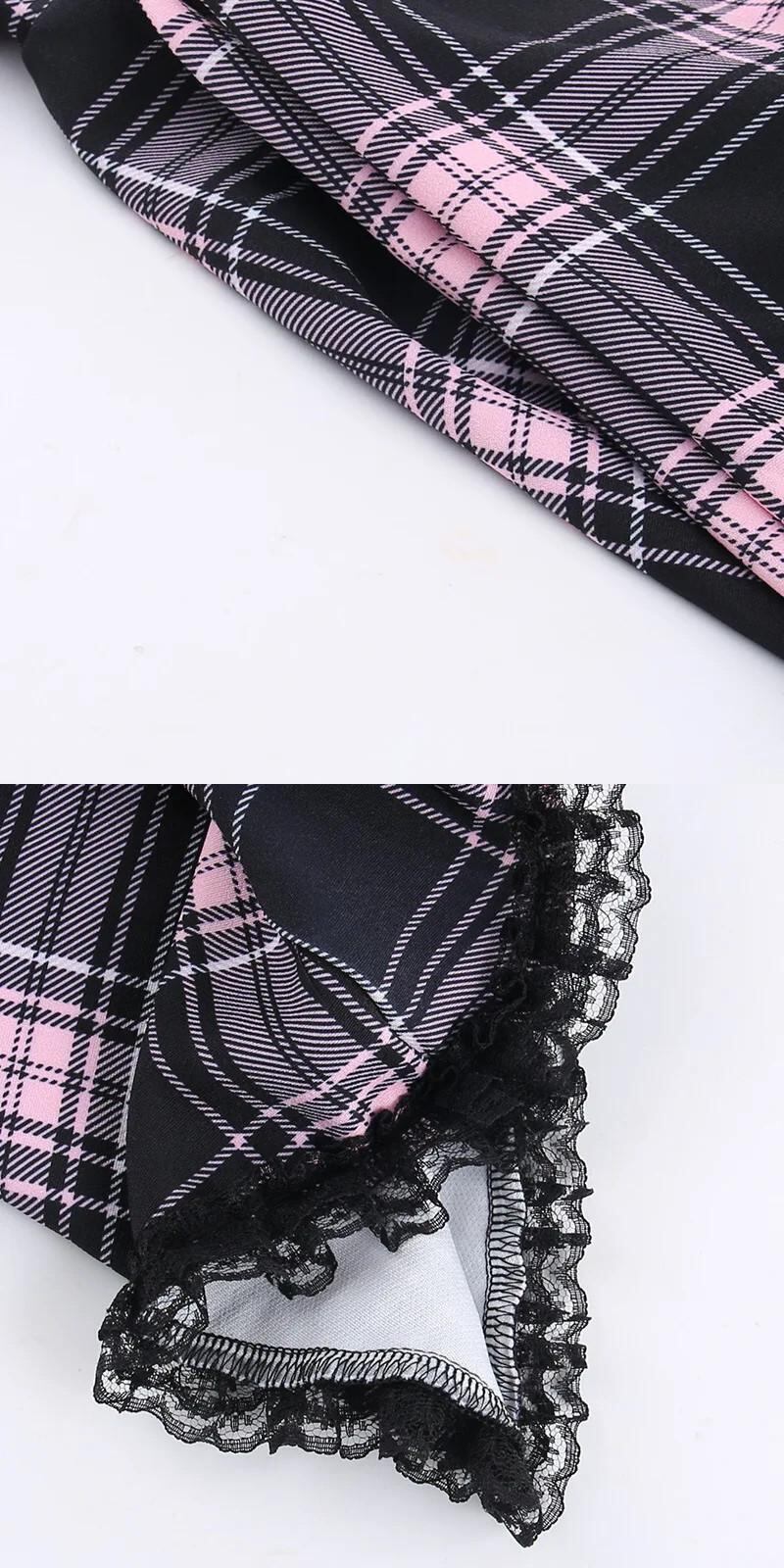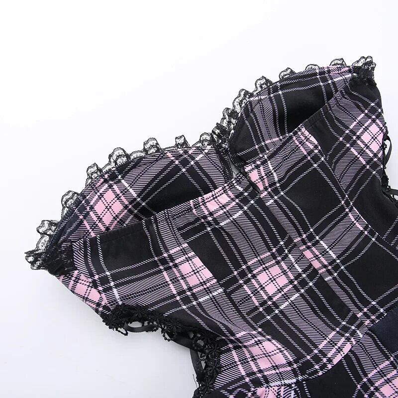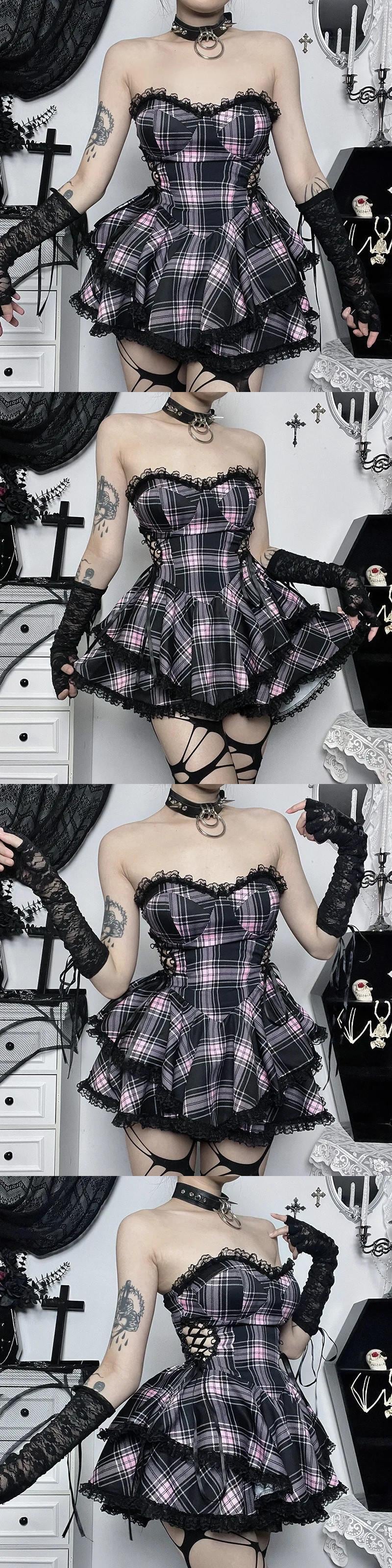 送料無料 ゴスダーク原宿ロリータゴシックチェック柄セクシーなチューブドレス E-グランジレースアップフリル裾ミニドレスかわいいパーティー衣装 ラッフル AE155588786368135455