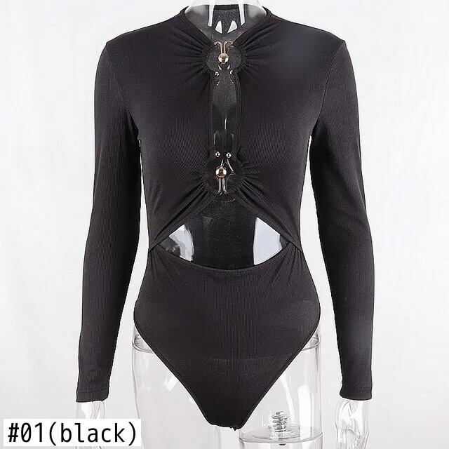 送料無料 ゴスダーク中空アウト Y2k セクシーなリブボディスーツゴシック長袖ボディコン女性 Tシャツ O リングシャーリング黒秋トップス ロング ブラック オータム 秋物 AE155588775298008660