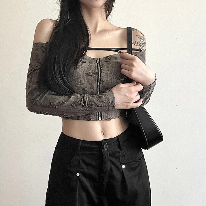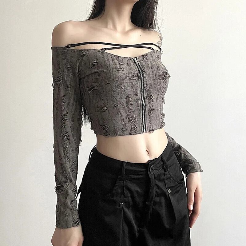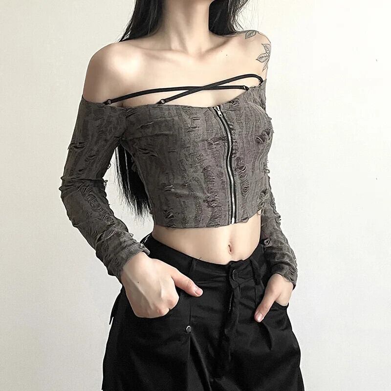 送料無料 ゴスダークヴィンテージゴシックオフショルダーセクシーな Tシャツグランジ Y2k ほつれジップアップ女性クロップトップス 90s 長袖スキニーストリート ロング ビンテージ AE155588786821136671