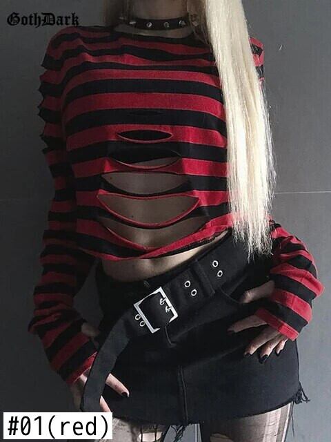 送料無料 ゴスダークパンクストライプセクシーな中空アウトクロップトップス女性モールゴシックグランジ美的 Tシャツ長袖 e ストリート衣装 ロング AE155588773228510210
