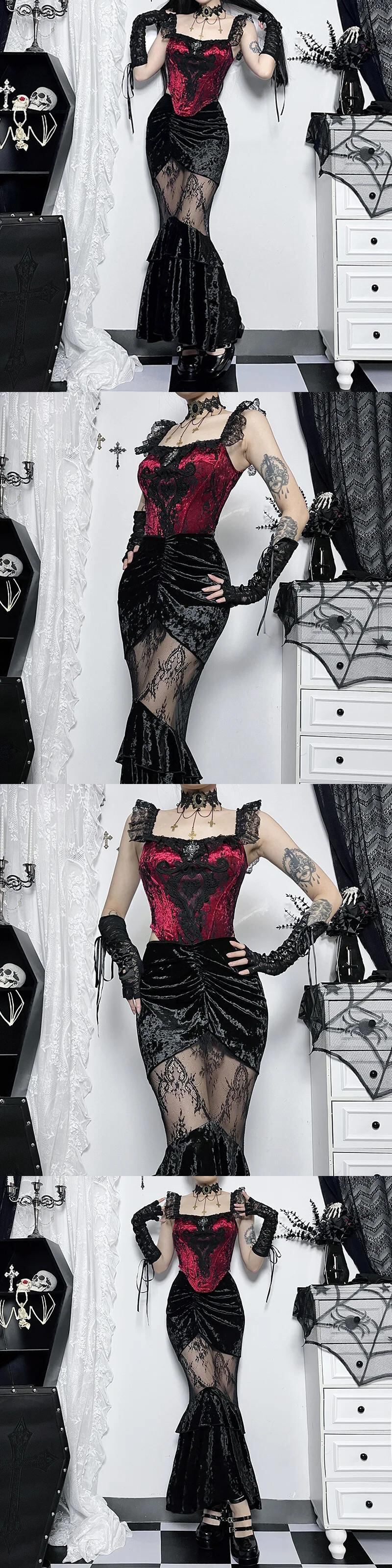 送料無料 ゴスダークシャーリングヴィンテージゴシック美的ベルベットスカートグランジメッシュスプライスセクシーなマーメイドスカート女性ウエストパーティーウェア ビンテージ AE155588762802683468