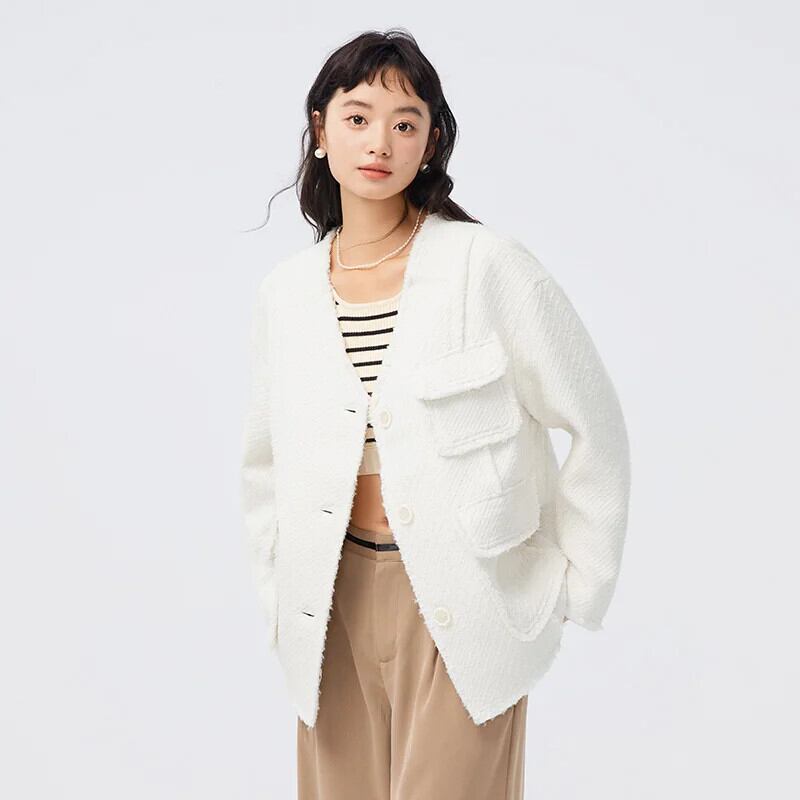 送料無料 Semir 女性コート秋ミッドレングスツイード小さな香り優しい V ネックルーズテルジャケット白衣の女性 ホワイト オータム 秋物 Vネック AE1212777723464650198