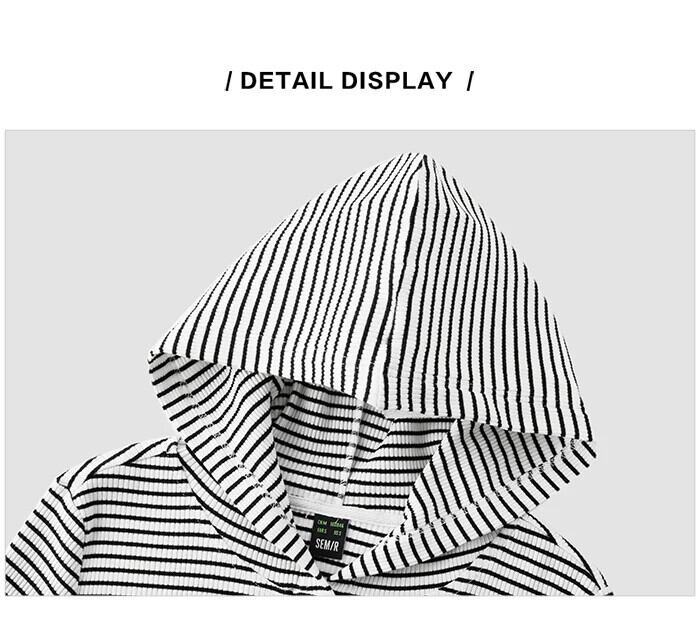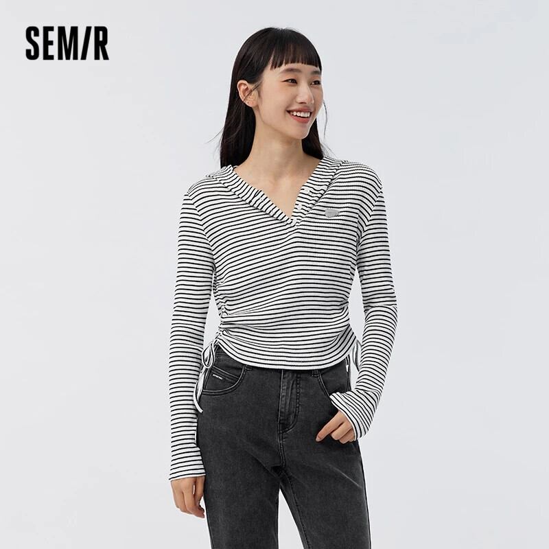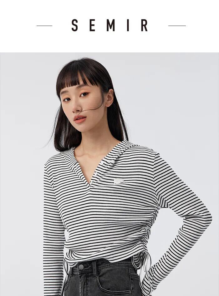 送料無料 Semir 2023 女性 Tシャツ春ショート巾着フード付きストライプシャツオールマッチ長袖 Tシャツ女性 ロング スプリング 春物 AE1212777740273644103