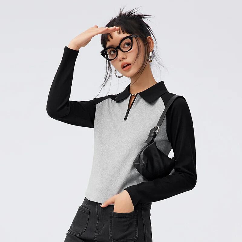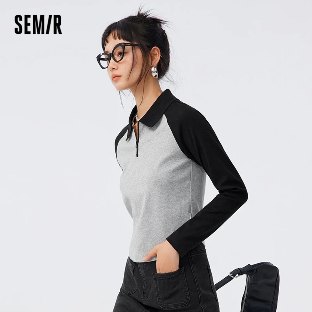 送料無料 Semir 2023 女性 Tシャツ長袖タイトフィットカラーマッチングラグラン袖ポロ襟秋の女性 ロング オータム 秋物 AE1212777712139383778