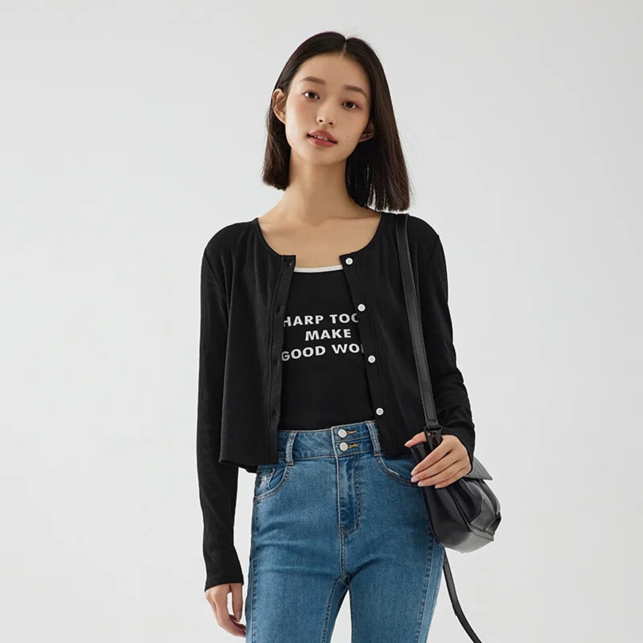 送料無料 Semir 2023 女性シャツ長袖 Tシャツ黒ニットカーディガン手紙サスペンダー秋スリム 2 点セット女性 ロング ブラック オータム 秋物 AE1212777794347923472