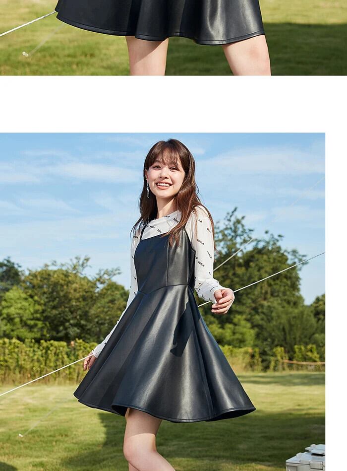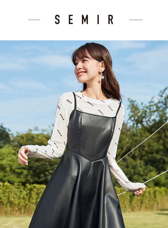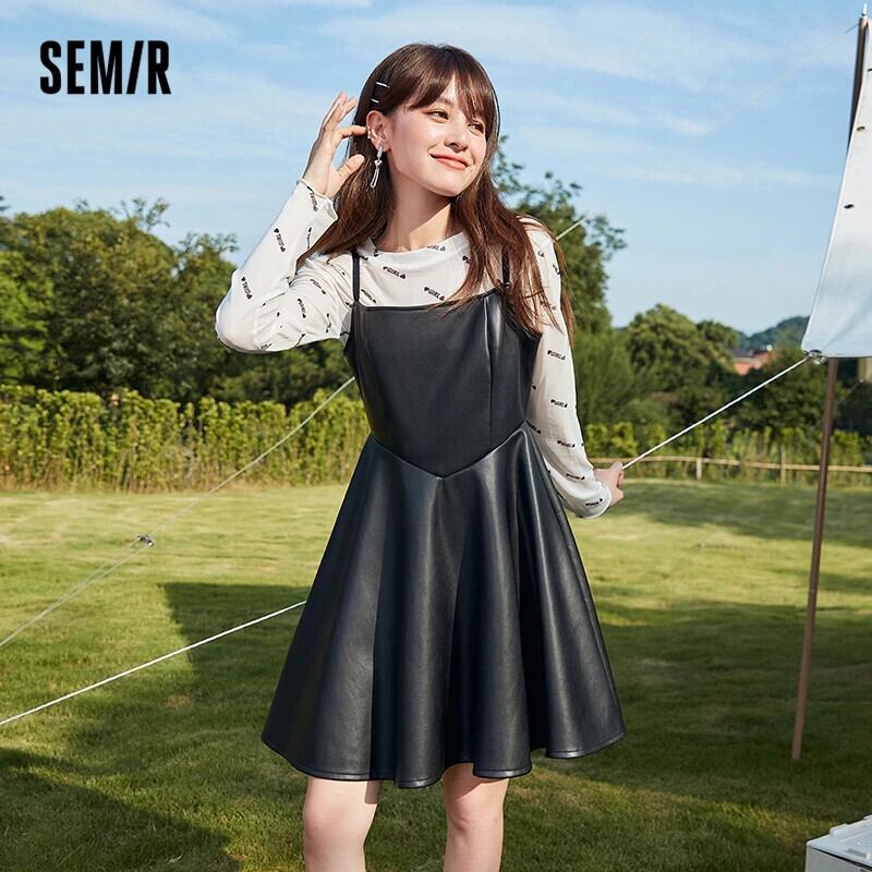 送料無料 Semir 女性ワンピースドレスサスペンダー小さな黒のドレス 2023 秋スタイル Pu 模造革ドレスフライドストリート多用途 ブラック オータム 秋物 レザー AE1212777717814562560