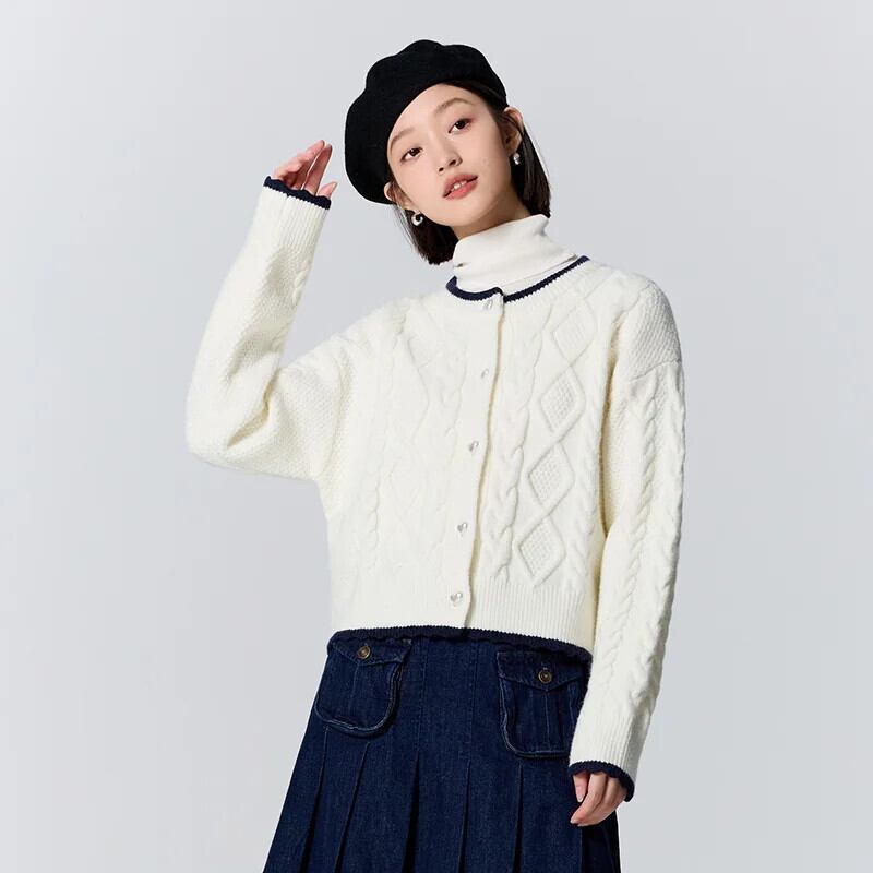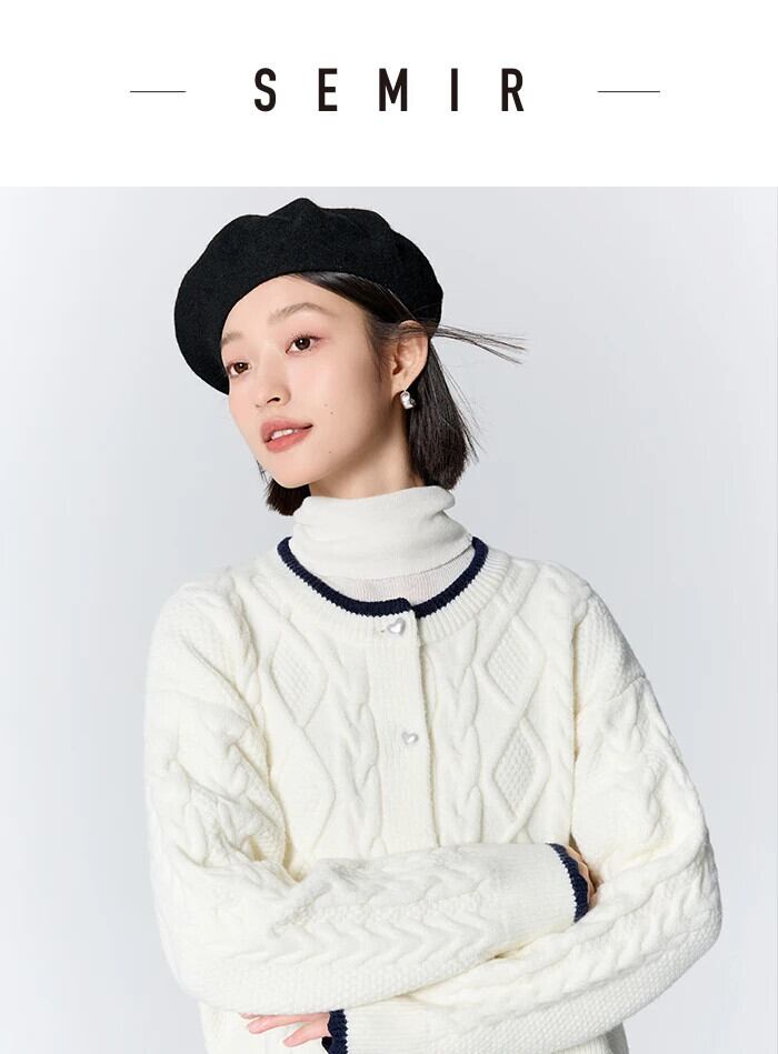 送料無料 Semir ニットカーディガン女性ショートコントラストカラールーズオフショルダー 2023 冬ケーブルセーター優しい気質 ウィンター 冬物 AE121277772094263927