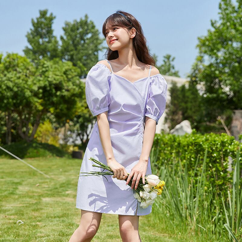 送料無料 Semir ドレス女性サスペンダーバブルスリーブショートドレス 2023 夏ソリッドカラースプリットドレスソルトスウィート 大人ガーリー キュート カジュアル サマー 夏物 AE1212777740763015427