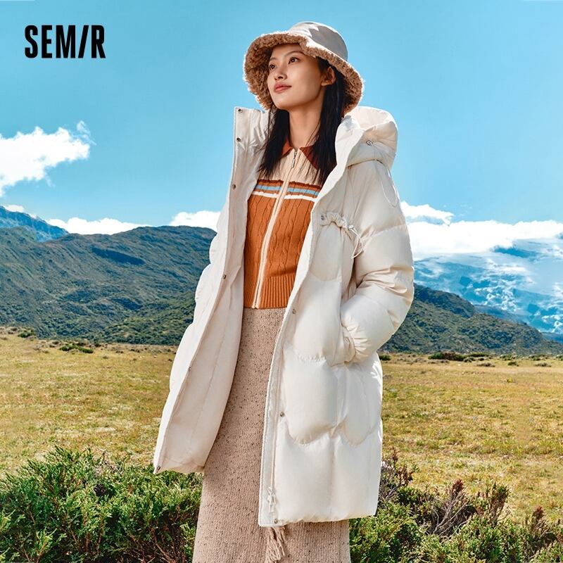 送料無料 Semir ダウンジャケット女性ロングゆったりと優しい 2023 冬暖かいフード付きテクスチャードジャケット レッド ウィンター 冬物 AE1212777796855016380