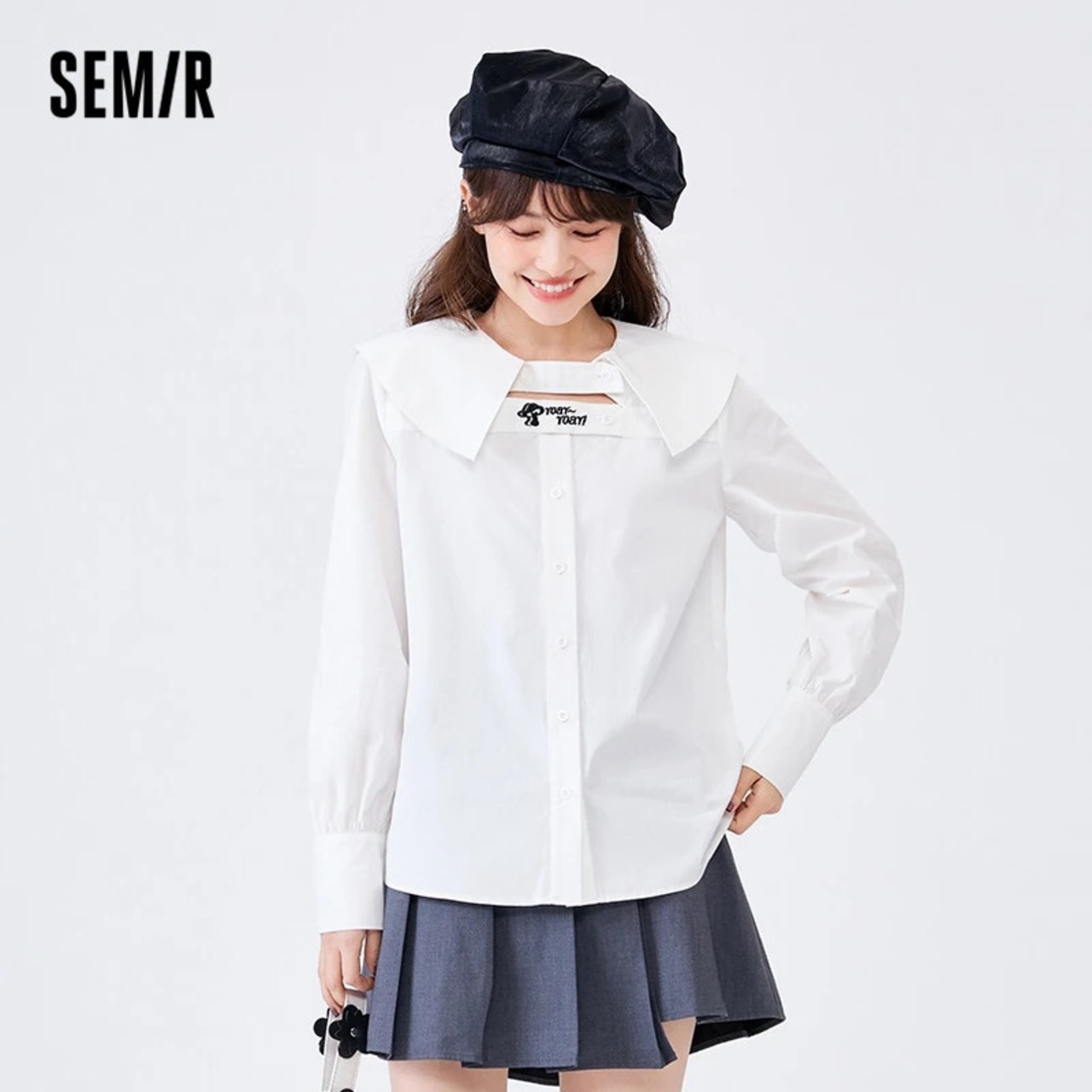 送料無料 Semir 長袖シャツ女性ラーペル白綿ブラウス 2023 春刺繍パーソナライズトップ ロング ホワイト レッド コットン スプリング 春物 AE1212777794386567671
