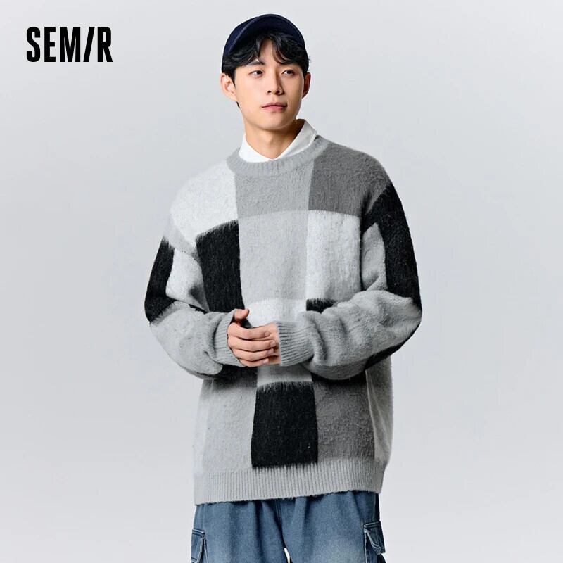 送料無料 Semir プルオーバーセーター男性 2023 冬コントラストカラーチェック柄ジャカードレトロトレンディルーズセーター ウィンター 冬物 AE1212777759673936782