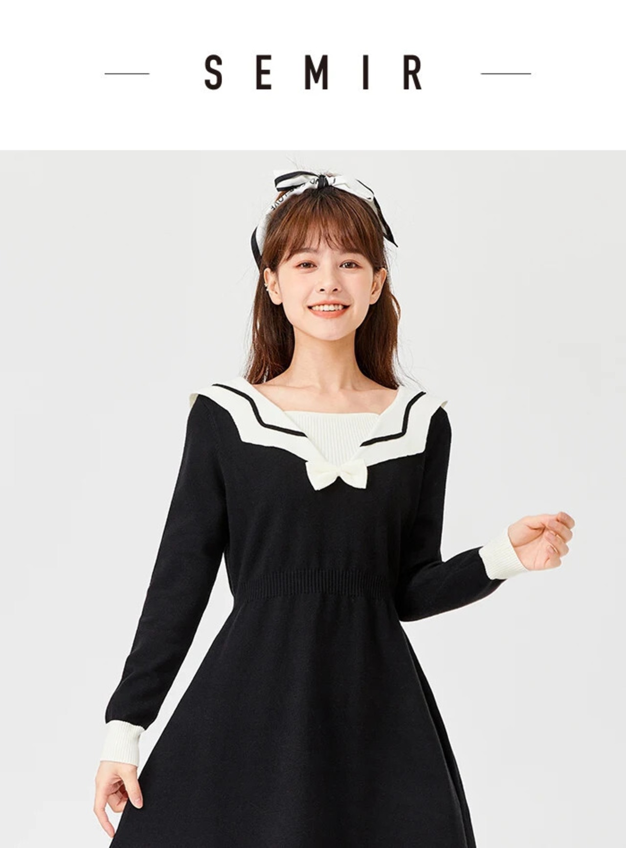 送料無料 Semir ドレス女性スリムブラックコントラストカラーネイビーカラー 2023 冬の弓ドレス リボン ウィンター 冬物 AE1212777763191225035