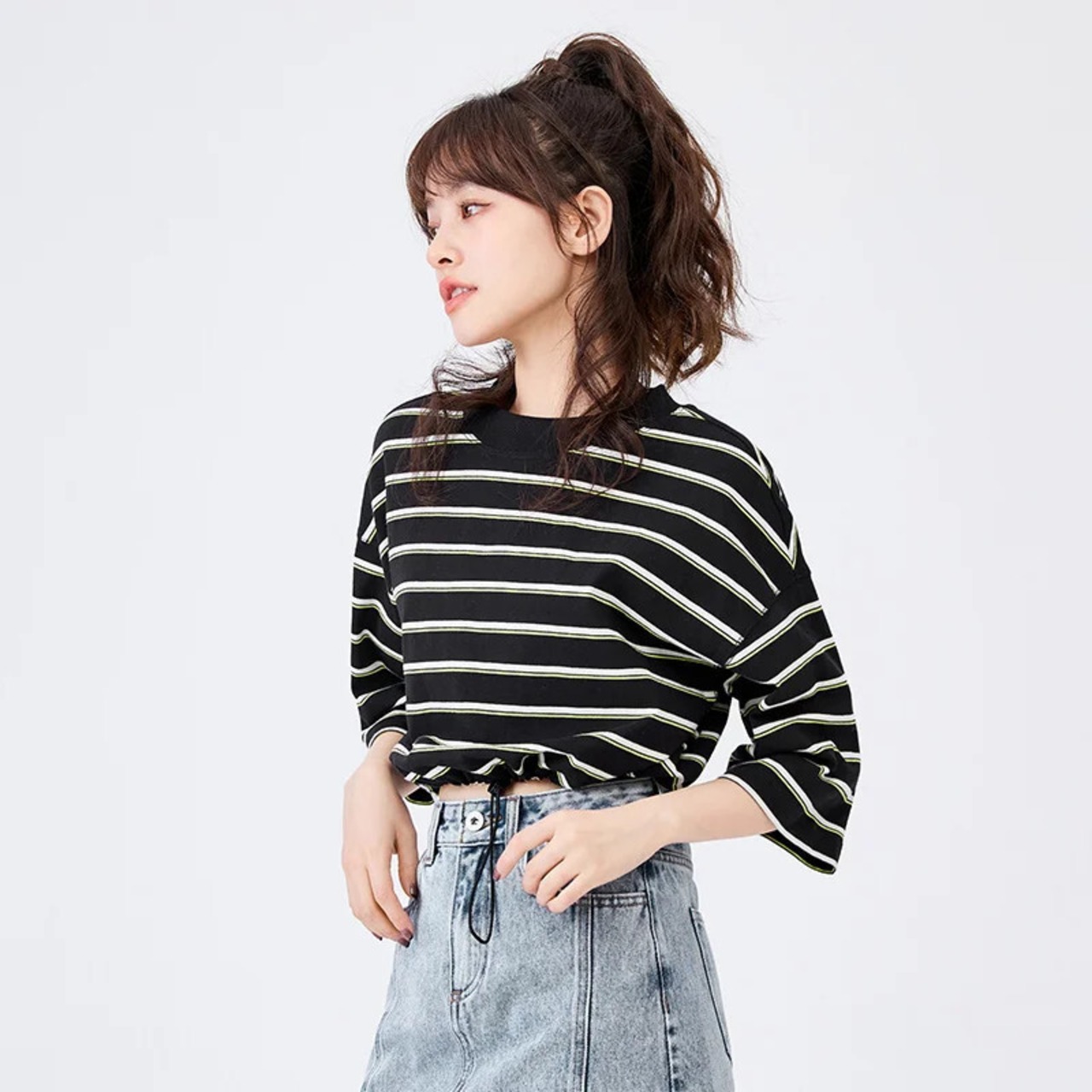 送料無料 Semir 2023 女性 Tシャツ春純粋な綿ストライプ底シャツ甘いトップウエスト半袖 Tシャツ女性 コットン 大人ガーリー スウィート キュート カジュアル スプリング 春物 ピュア AE1212777767860490706