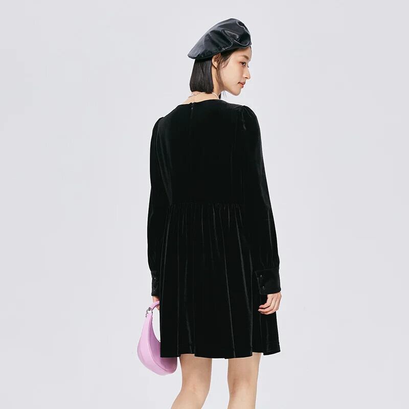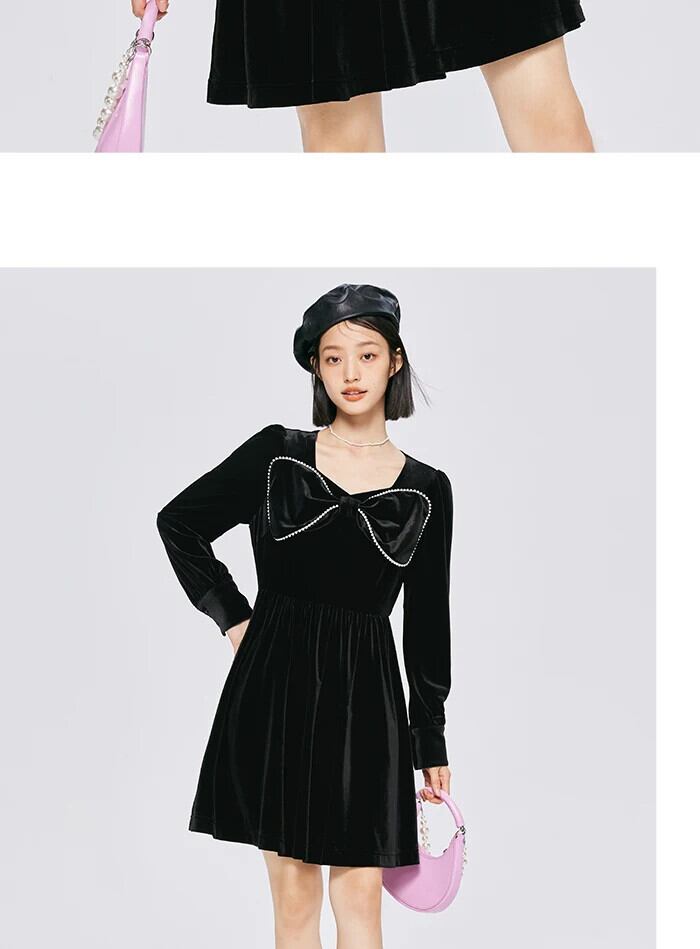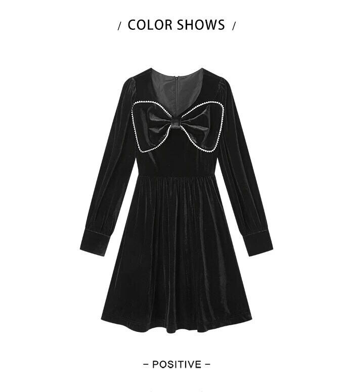送料無料 セミールドレス女性ベルベットバブルスリーブブラックドレス 2023 秋ちょう結びドレスヘップバーンスタイル リボン オータム 秋物 AE1212777757065166218