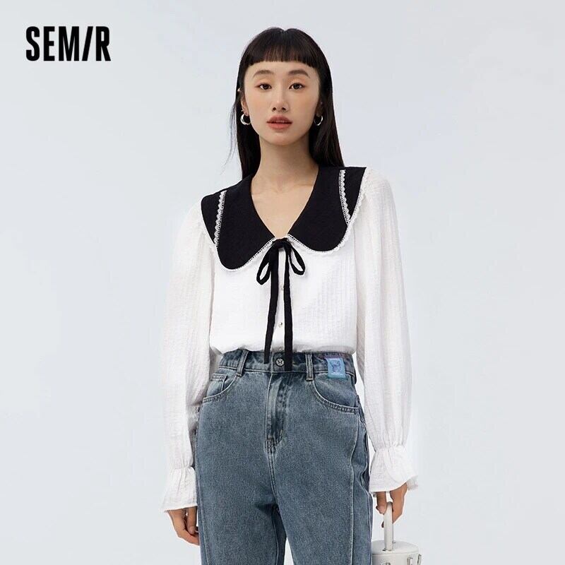 送料無料 Semir 長袖ブラウス女性コントラストカラー優しい甘いスタイル 2023 春スタイルガールフィーリング大きなラペルテクスチャシャツ ロング 大人ガーリー スウィート キュート カジュアル スプリング 春物 AE1212777765571291665