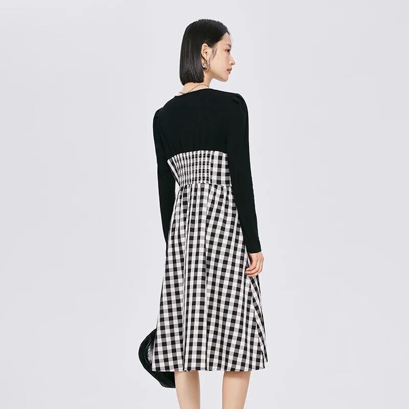 送料無料 Semir ドレス女性チェック柄スプライススリム 2023 秋ラウンドネックバブルスリーブ気質ライト成熟したスタイルミッドレングスドレス オータム 秋物 Oネック AE1212777778821414481