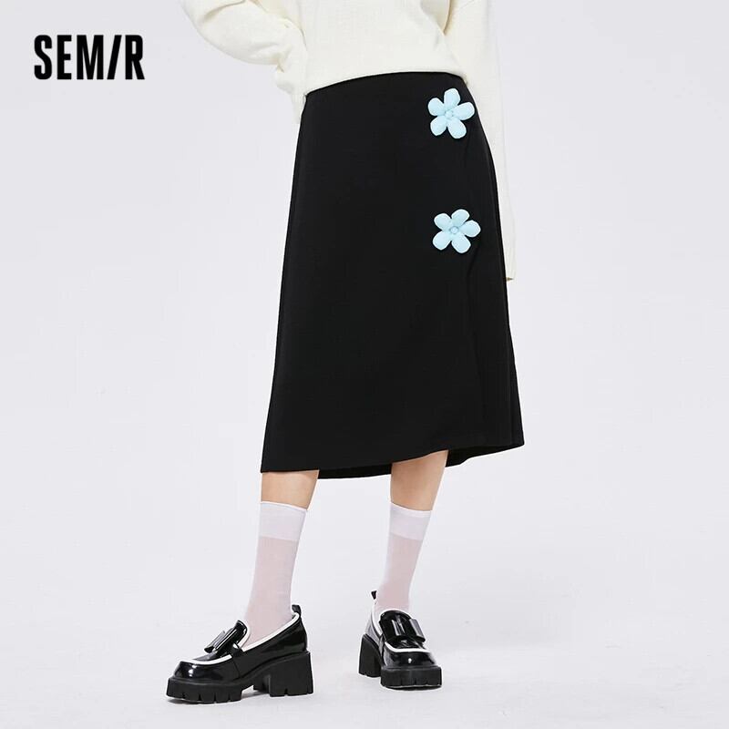 送料無料 Semir 2023 女性スカートガーリッシュ甘い花ミッドレングススカートスリット黒ニットスカートスカート女性 ブラック 大人ガーリー スウィート キュート カジュアル フラワーデザイン AE1212777795735571728