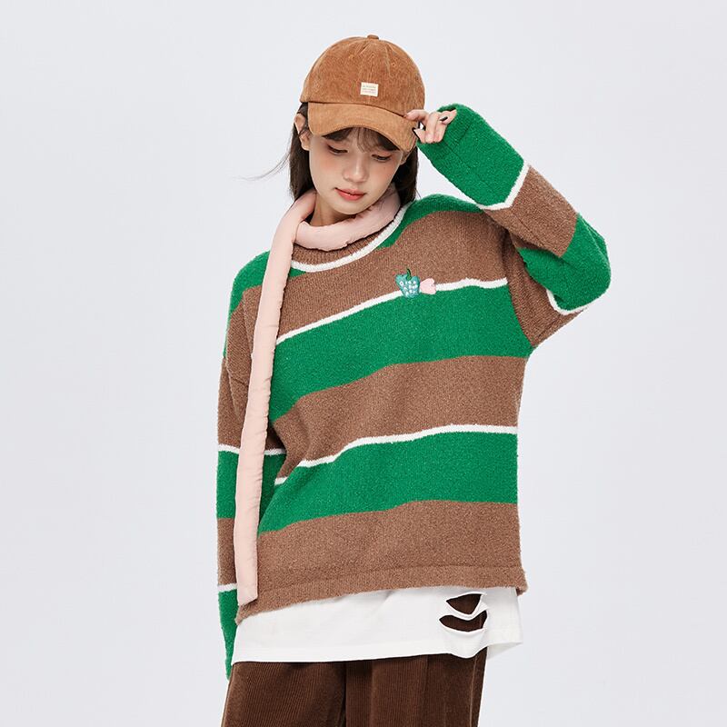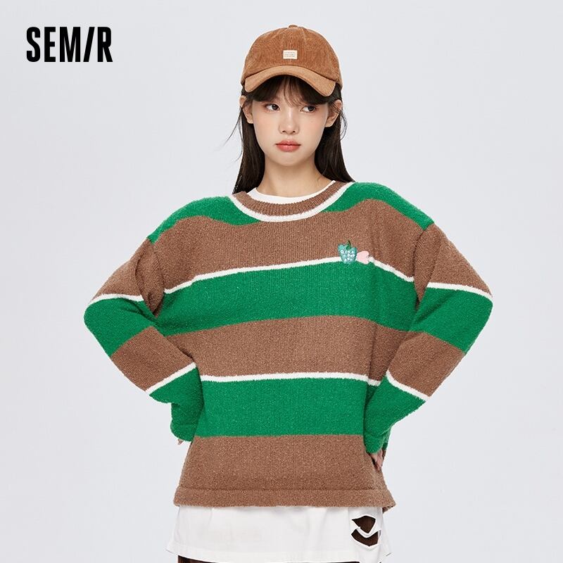送料無料 Semir セーター女性刺繍ルーズストライプシャツ 2023 冬レトロコントラストカラートレンディクールセーター レッド ウィンター 冬物 AE1212777723636689879