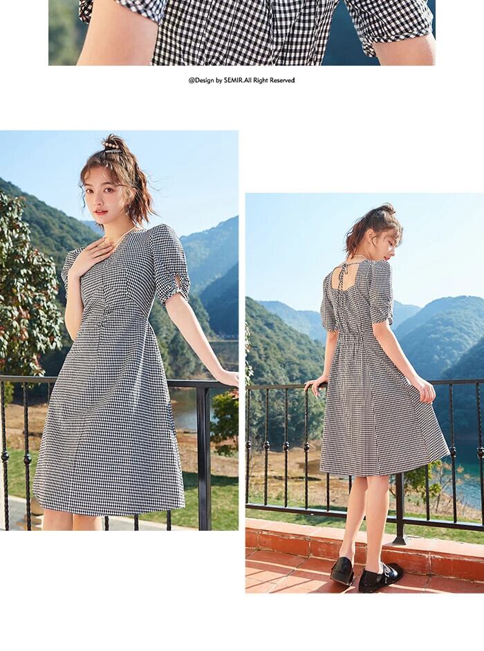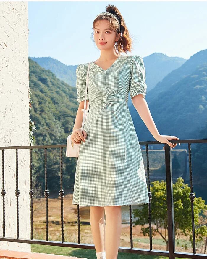 送料無料 セミールドレス女性 V ネックパフスリーブテクスチャードチェック柄ドレス 2022 夏の気質スリムドレス甘い レッド 大人ガーリー スウィート キュート カジュアル サマー 夏物 Vネック AE1212777718405861088