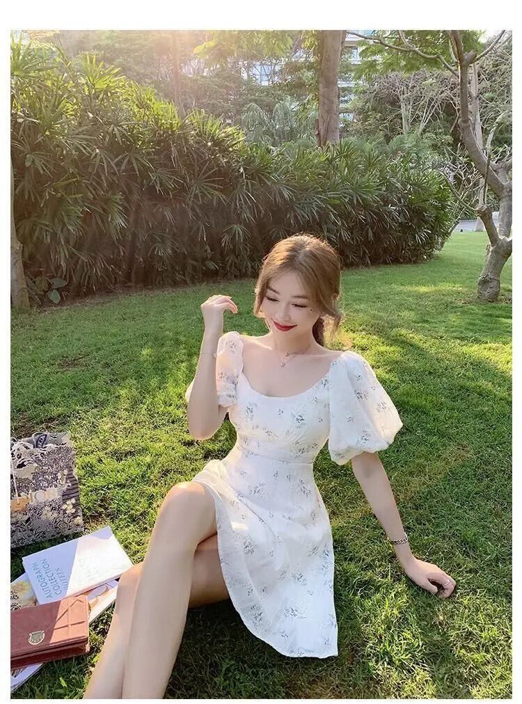 送料無料 パフスリーブフレンチフローラルプリントマキシミニ女性ドレスオフィスレディスタイルドレス女性 2022 夏 サマー 夏物 花柄 会社 学校 通勤や通学にも AE008878770373809693