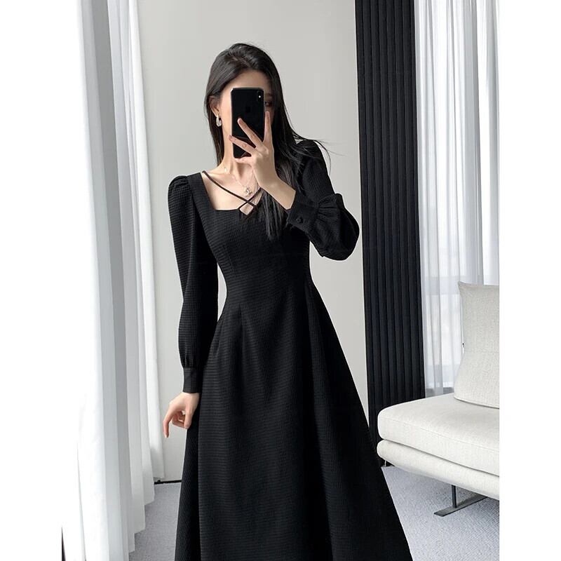 送料無料 固体パフスリーブミディドレス女性イブニングオフィスレディ A ライン服 Vestdios 春 2022 ブラック スプリング 春物 Aライン ソリッドカラー 会社 学校 通勤や通学にも AE008878789761490081