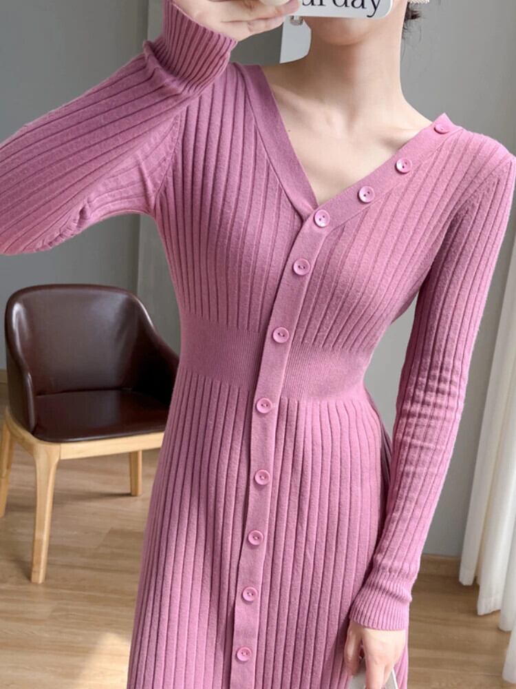 送料無料 V ネック長袖ボタンニットドレス女性スリムフィットセーターイブニングミディボディコンドレス冬秋 ロング オータム 秋物 ウィンター 冬物 Vネック AE008878757297569400