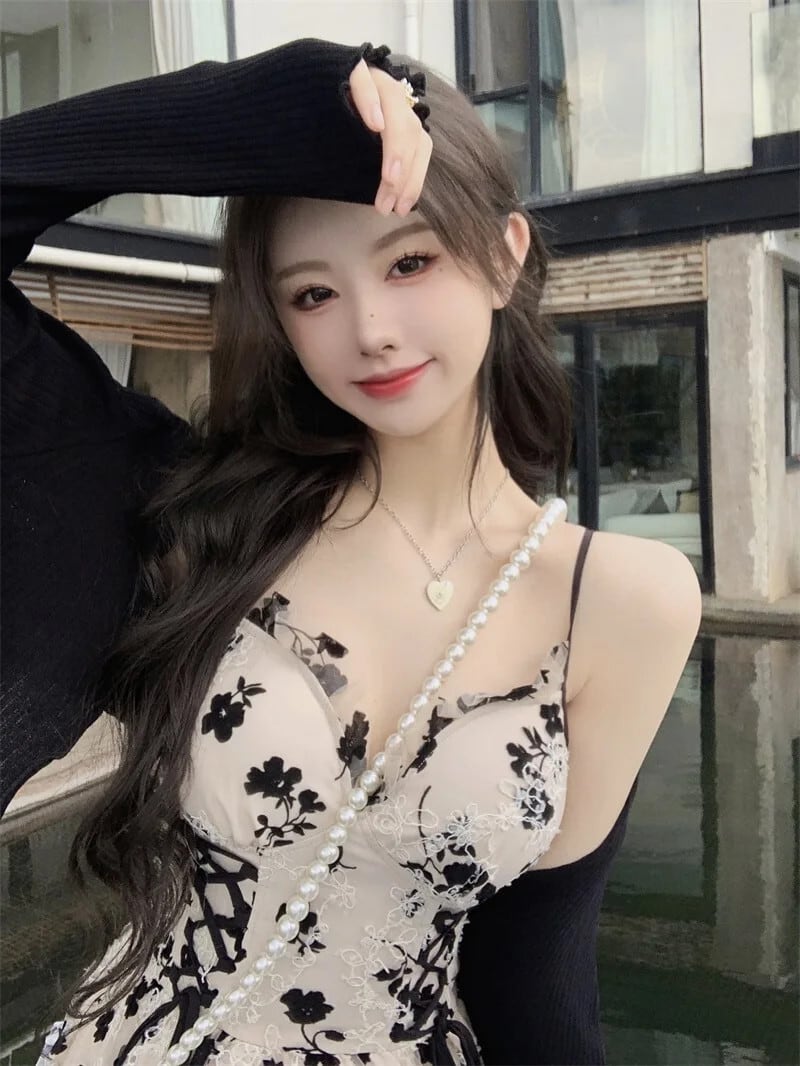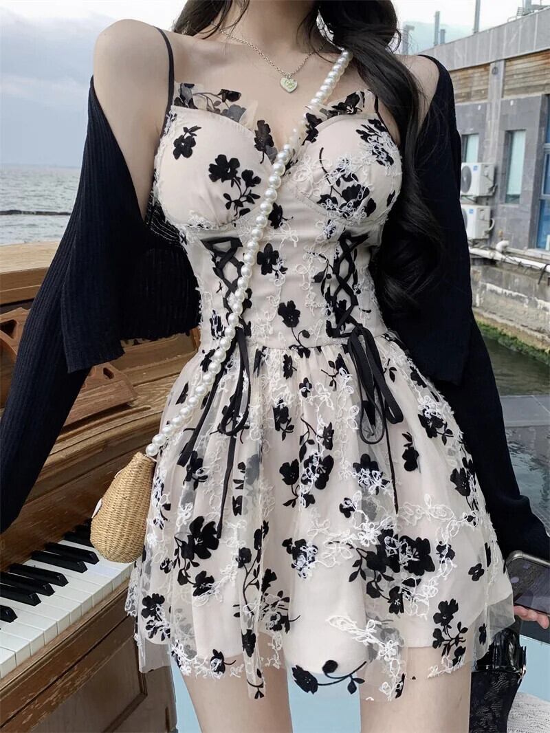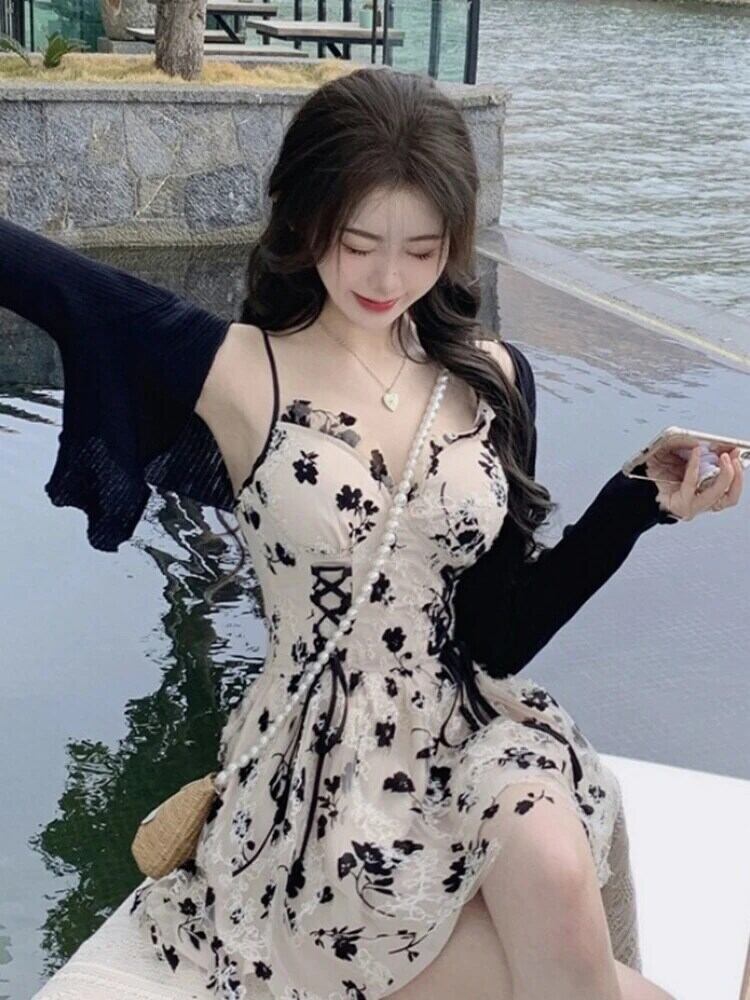 送料無料 甘いプリント長袖ニットカーディガンクロップコートツーピースドレス巾着花 V ネックフレンチサスペンダーローブスーツ女性 ロング 大人ガーリー スウィート キュート カジュアル 花柄 Vネック AE008878750455544901