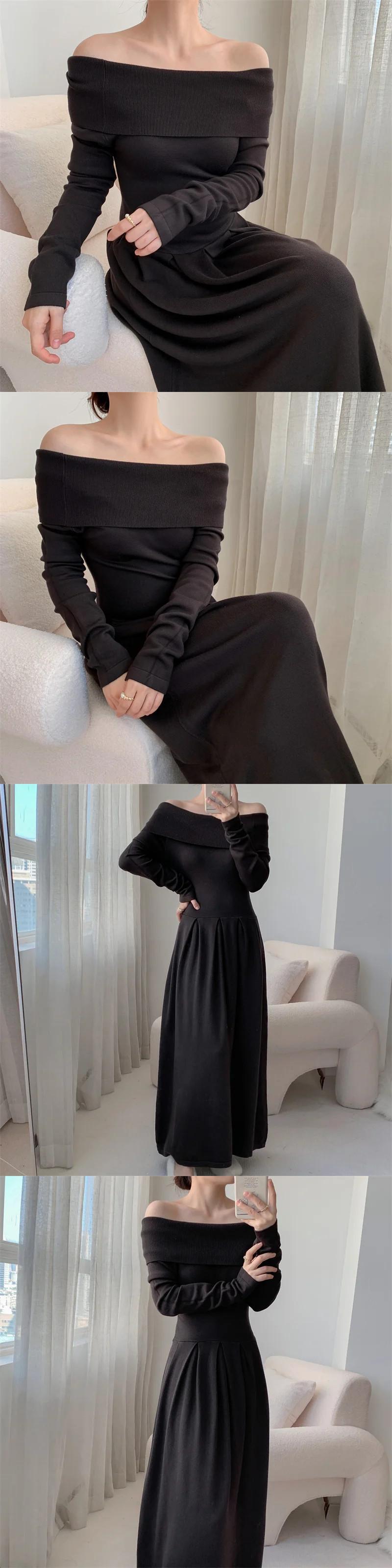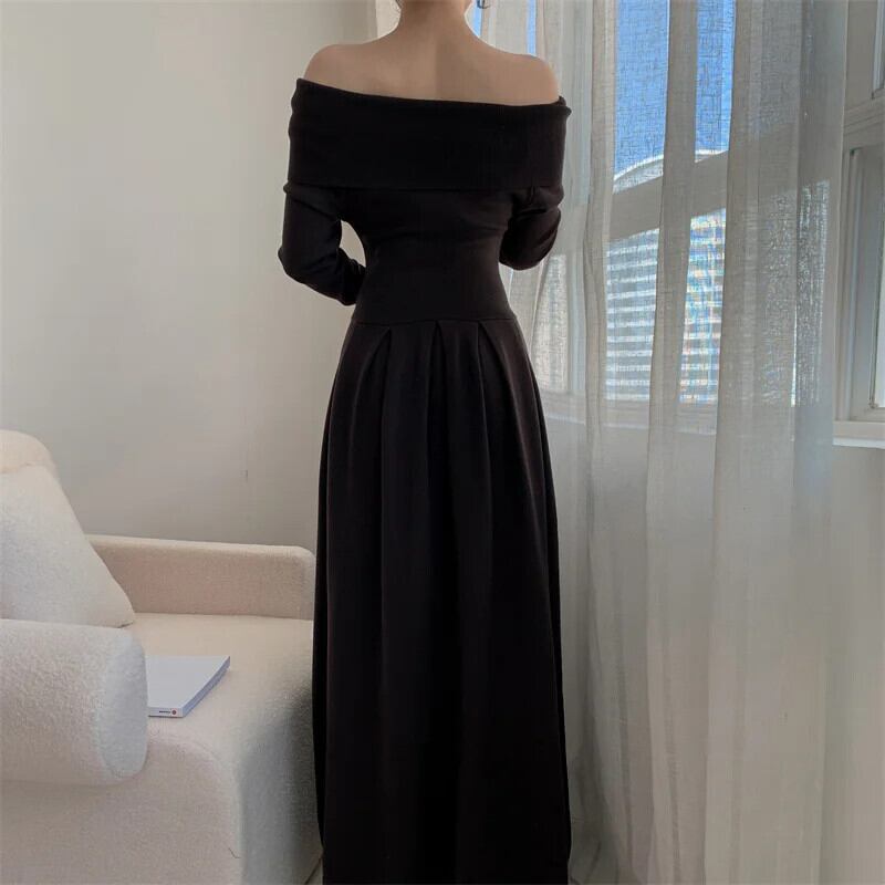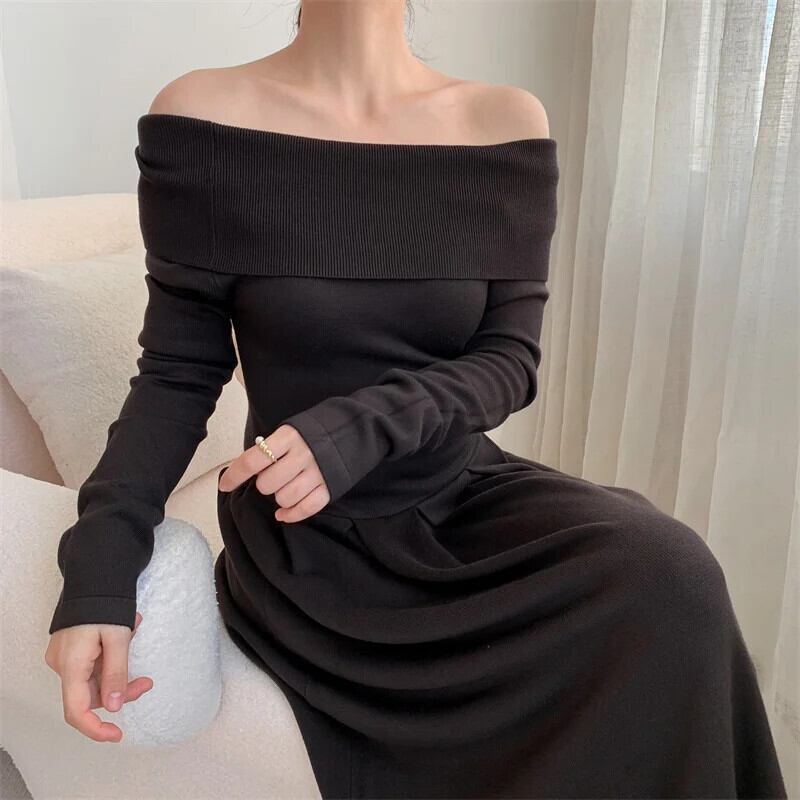 送料無料 長袖スラッシュネックオフショルダーニットセーターマキシドレス女性のセクシーなパーティーオフィスレディ冬 ロング ウィンター 冬物 会社 学校 通勤や通学にも AE008878712650670787