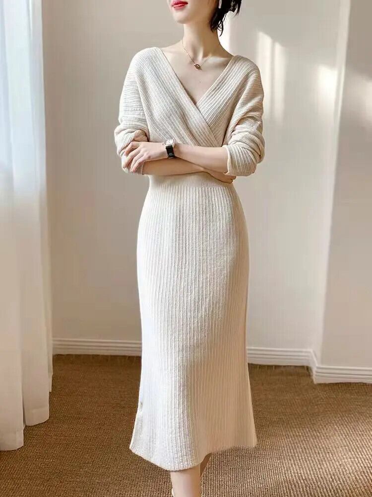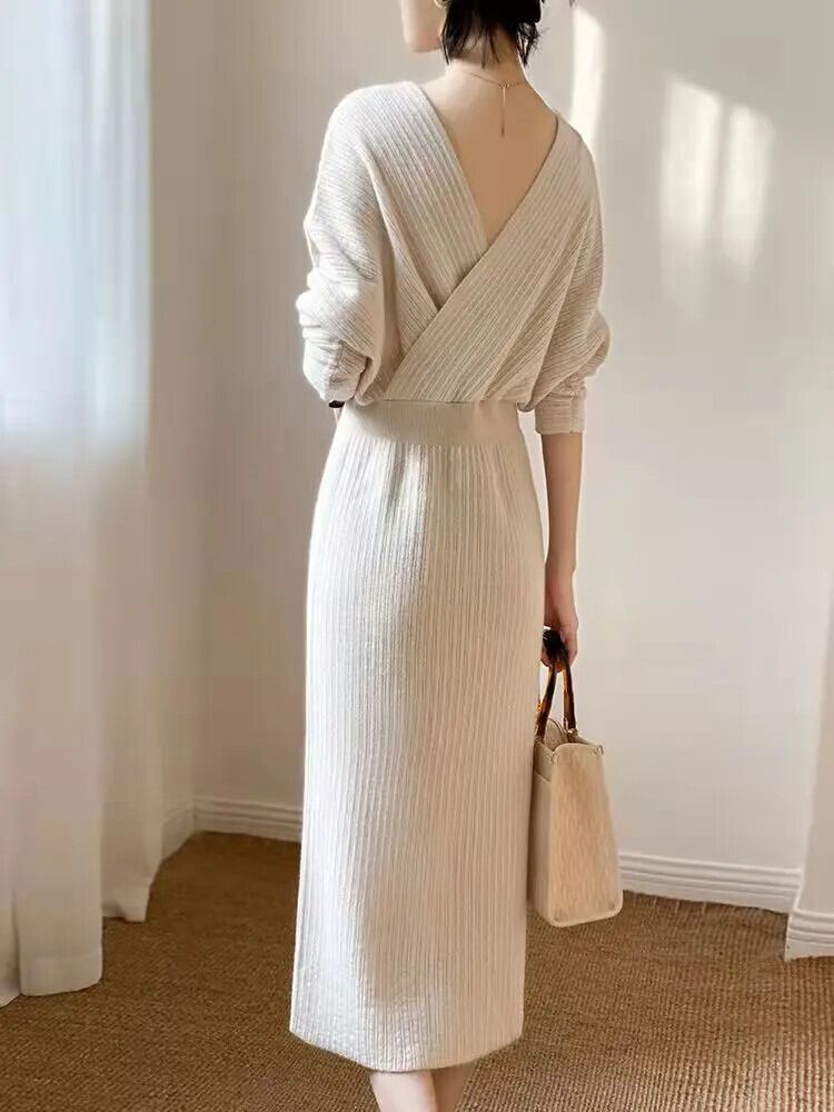 送料無料 ヴィンテージフレンチ V ネックソリッドセーターニット長袖ドレス女性背中の開いたニットドレスローブ秋 2022 ロング オータム 秋物 Vネック ソリッドカラー ビンテージ AE008878767277547302