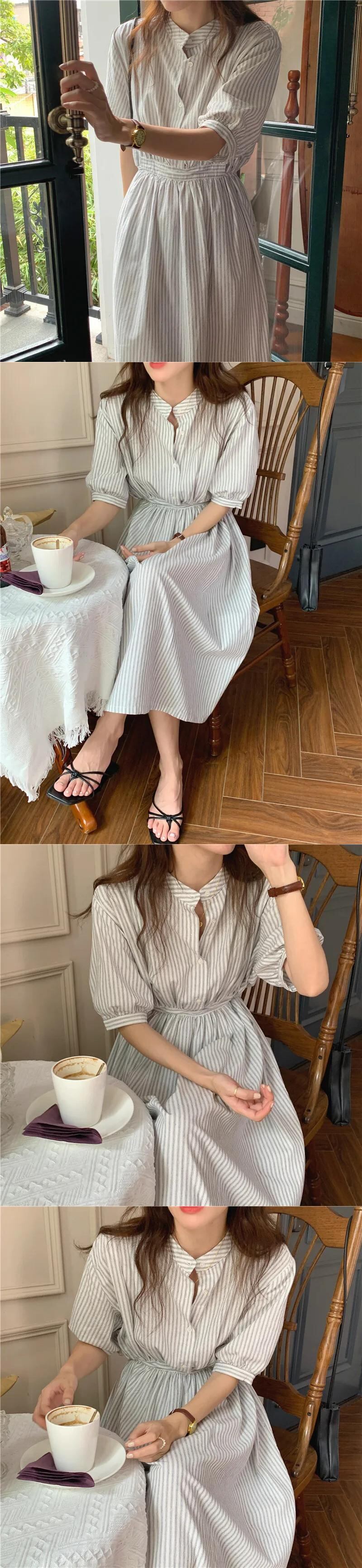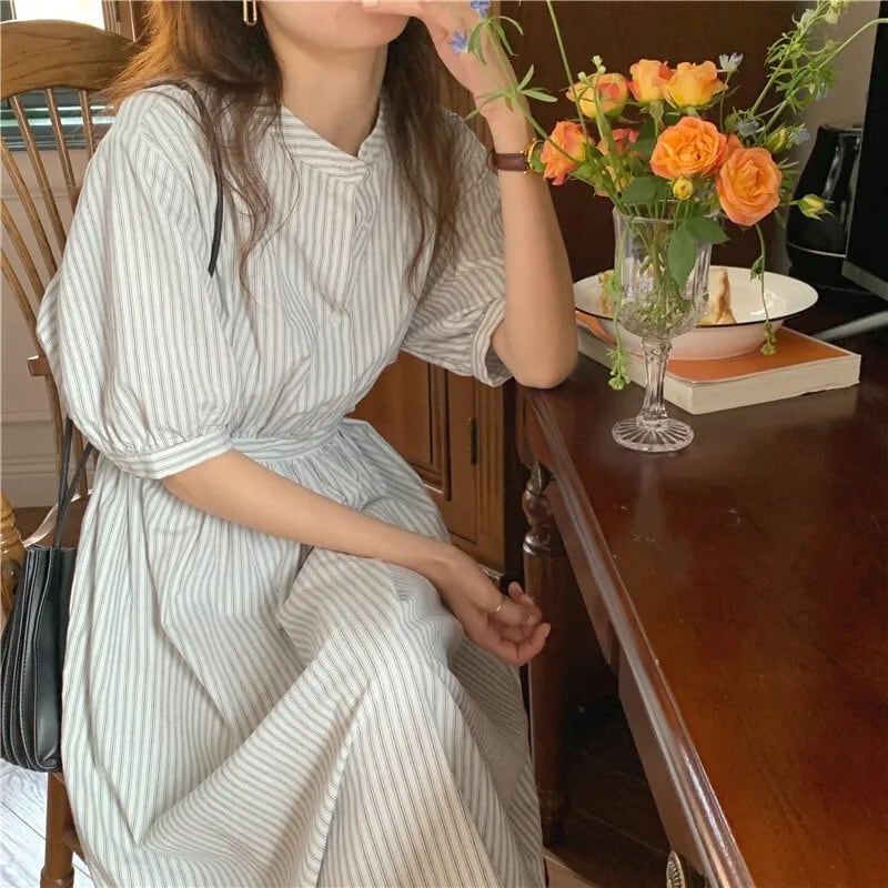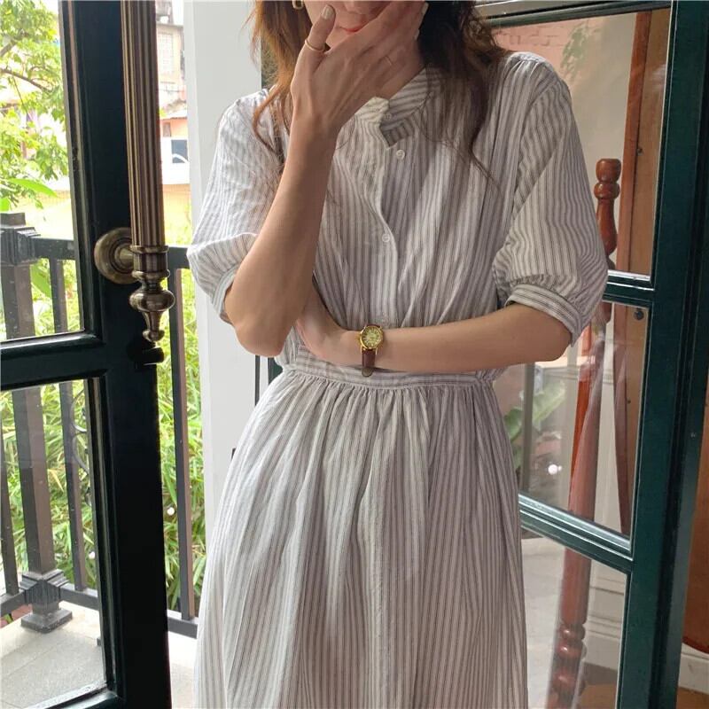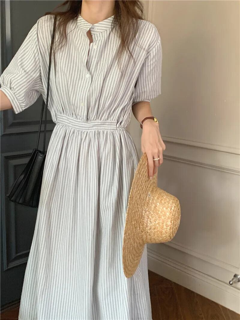 送料無料 サマードレスの女性 2023 シックなスタイルの女性シングルブレストボタンストライプロングシャツボディコンドレス 夏物 AE008878748179126082