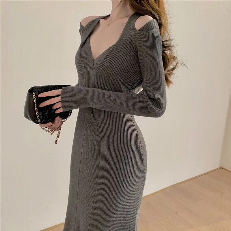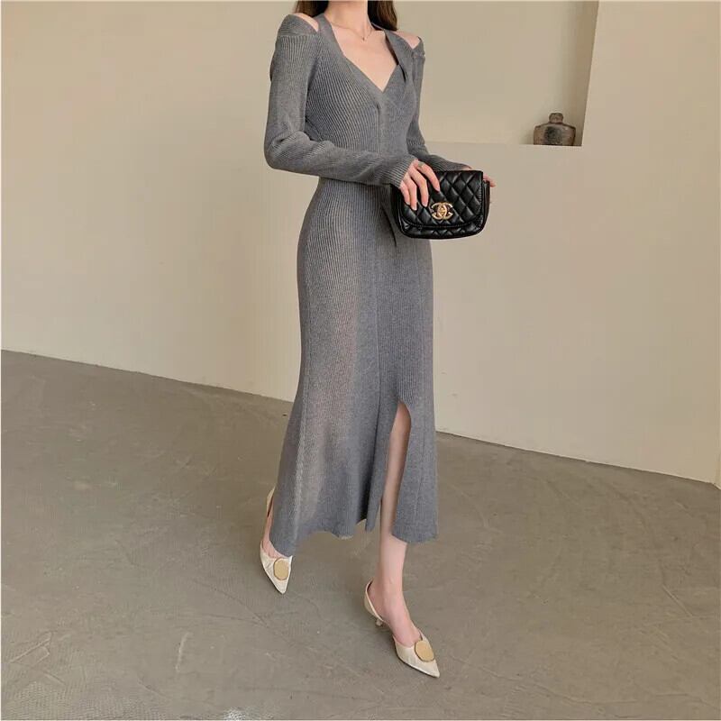 送料無料 ヴィンテージニットドレスパーティーナイトオフショルダー V ネックプルオーバーミディアムトレンドシーススプリットセクシーなロングドレス冬 2021 ウィンター 冬物 Vネック ビンテージ AE008878784081341557