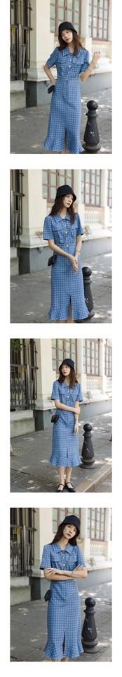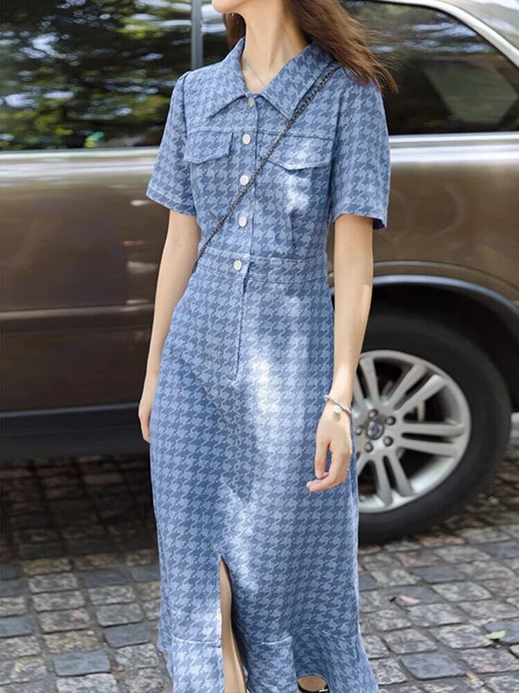 送料無料 ヴィンテージデニム鳥格子ボディコンイブニングドレス女性ポロ襟ミディドレスストリート夏 サマー 夏物 ビンテージ AE00887879203290186 | 女性の為の通販サイト-fashion navi