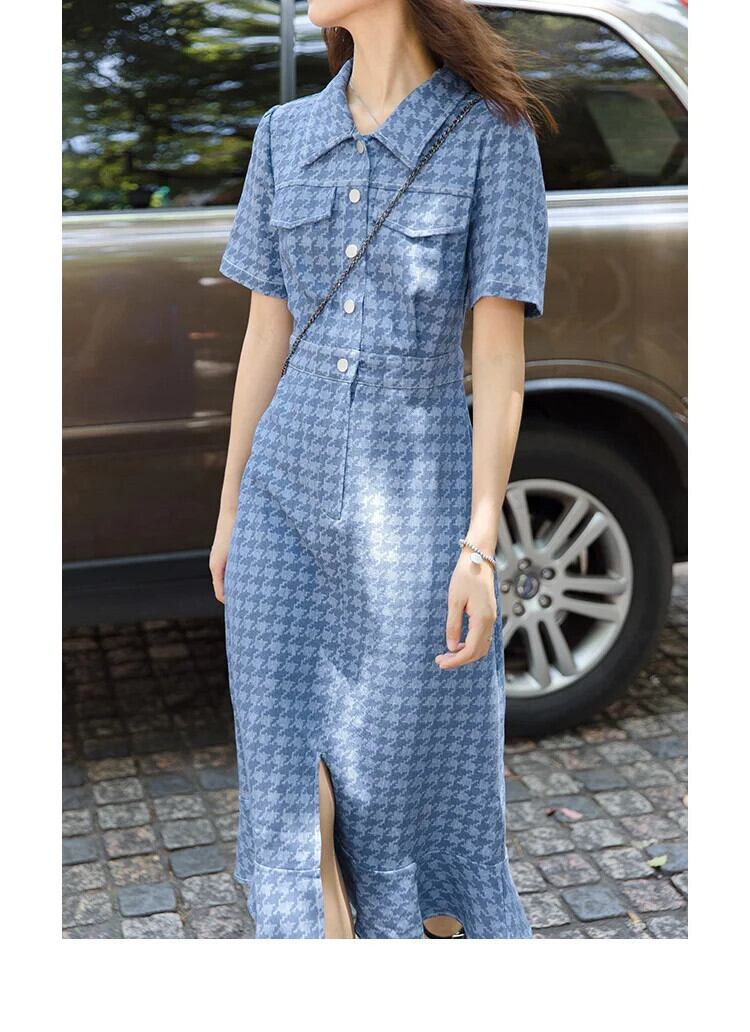 送料無料 ヴィンテージデニム鳥格子ボディコンイブニングドレス女性ポロ襟ミディドレスストリート夏 サマー 夏物 ビンテージ AE00887879203290186