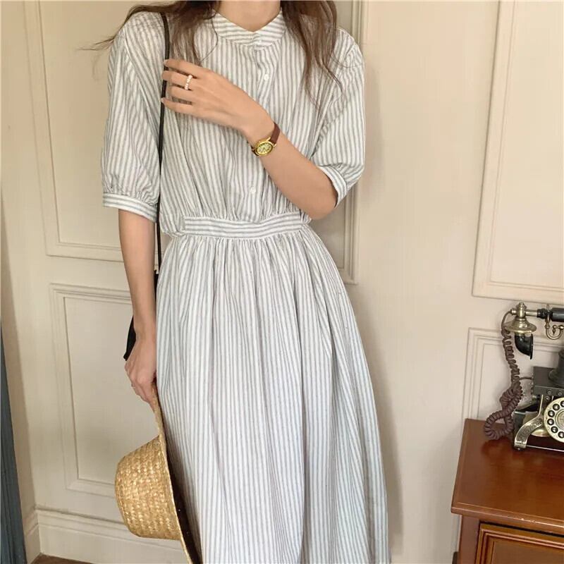 送料無料 サマードレスの女性 2023 シックなスタイルの女性シングルブレストボタンストライプロングシャツボディコンドレス 夏物 AE008878710852155006