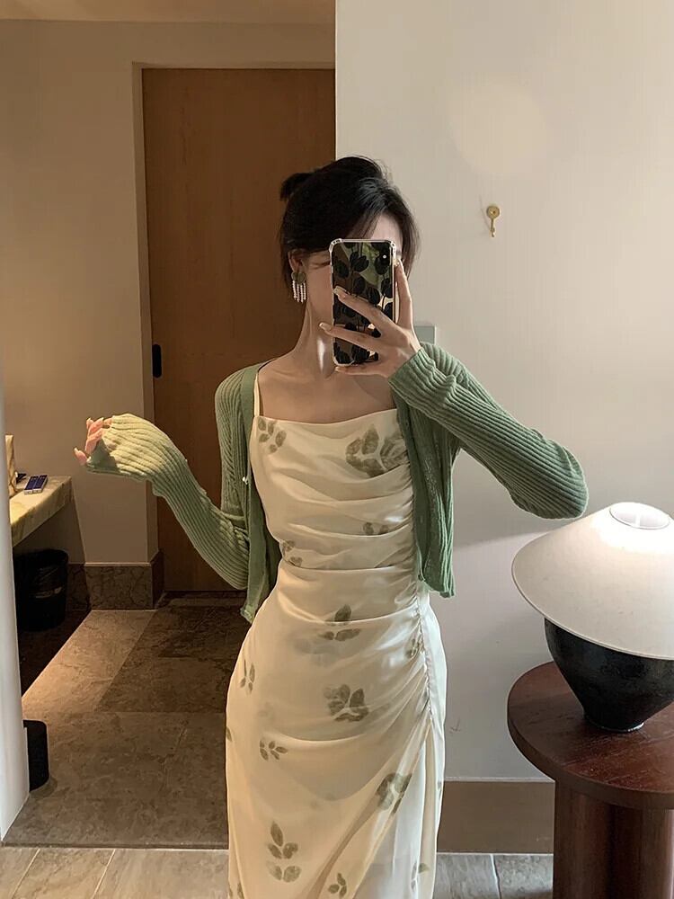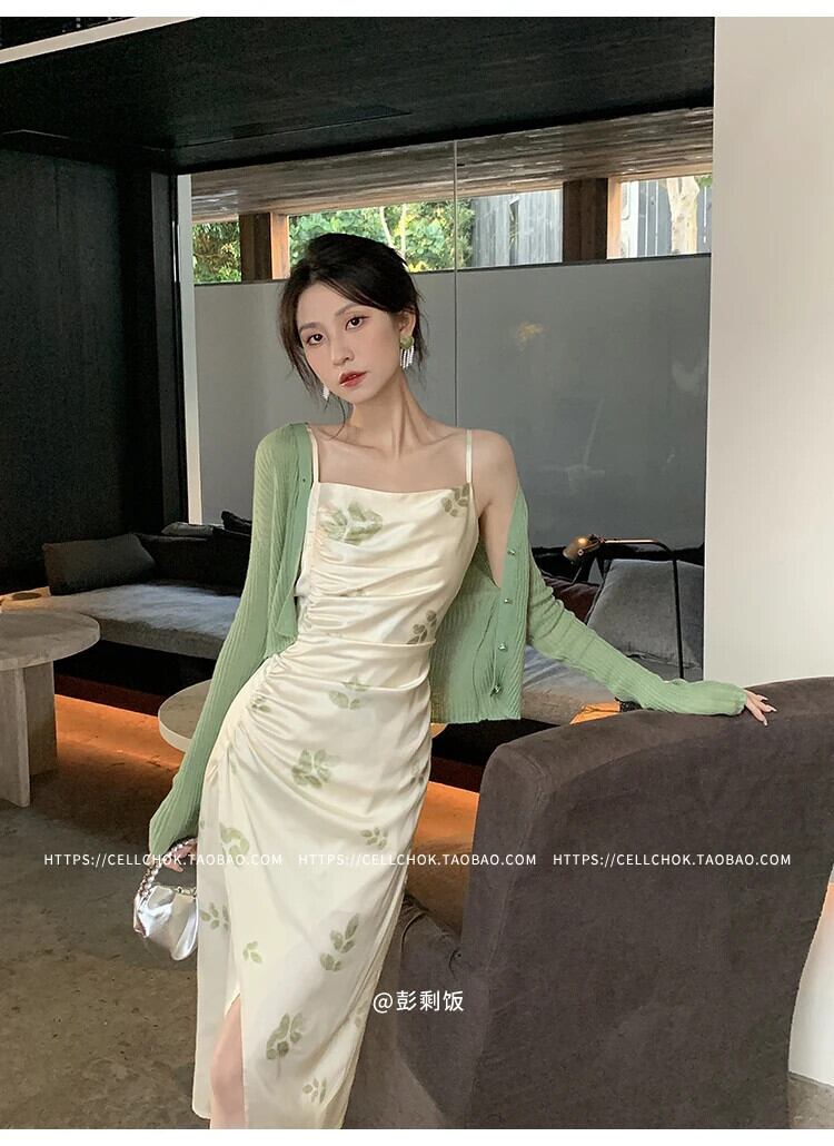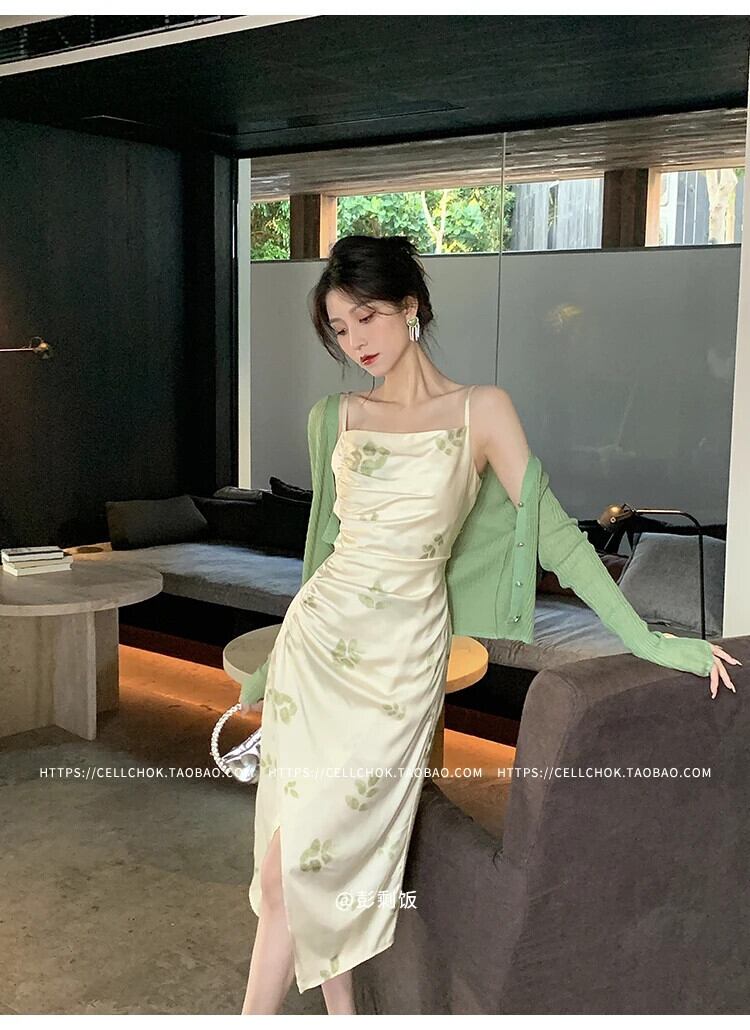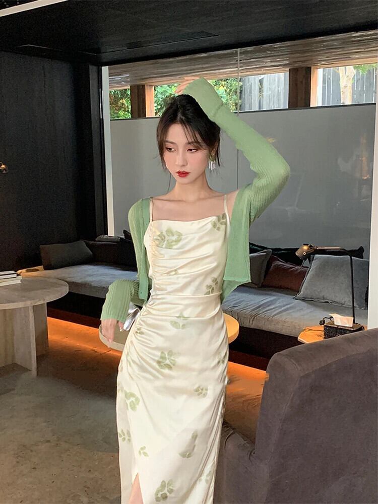 送料無料 セクシーなニットカーディガンプリントスパゲッティストラップバックレススプリットノースリーブボディコンドレススーツツーピースセットレディース衣装 AE008878791914601258