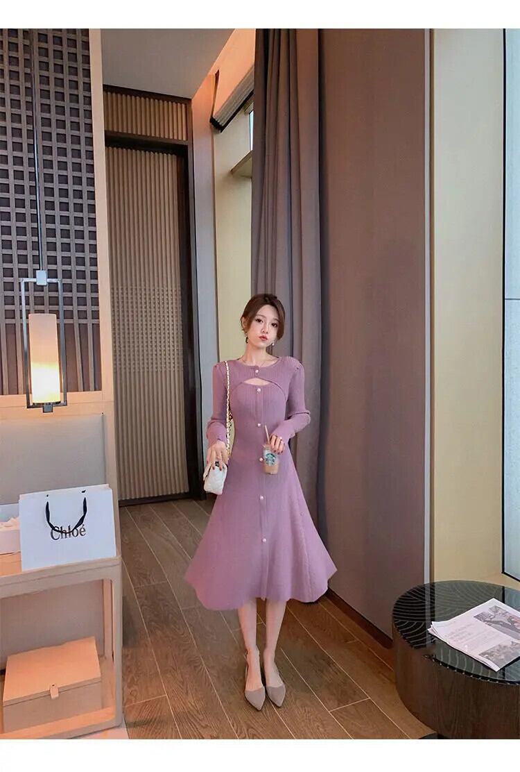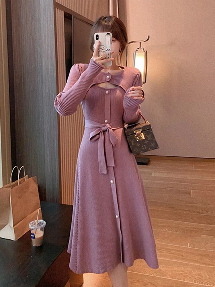 送料無料 冬のニットワンピースドレス女性長袖ボタンセーターミディドレスオフィス 2022 秋 ロング オータム 秋物 ウィンター 冬物 会社 学校 通勤や通学にも AE008878777216737195