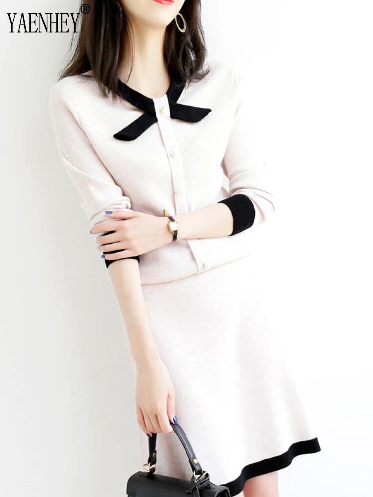 送料無料 女性セータースカートスーツニットスカートスーツ弓ボタンツーピースセットレディース衣装冬 2023 リボン ウィンター 冬物 AE008878779714747493