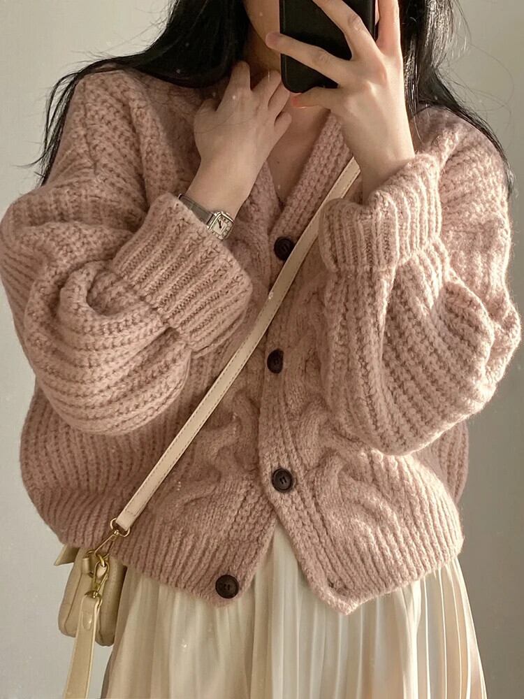 送料無料 ヴィンテージ固体カーディガン作物の女性 V ネックシングルブレストルーズ厚いセーターニット冬服 ウィンター 冬物 Vネック ソリッドカラー ビンテージ AE008878787842114158
