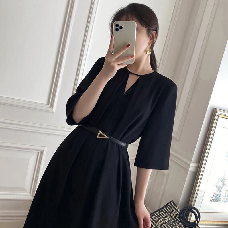 送料無料 A ラインドレス女性パーティーベルト付きフランスオフィスレディレトロ 3 クォーター V ネックルーズ女性ドレス夏 サマー 夏物 ハーネス Vネック Aライン 会社 学校 通勤や通学にも AE008878794668480764