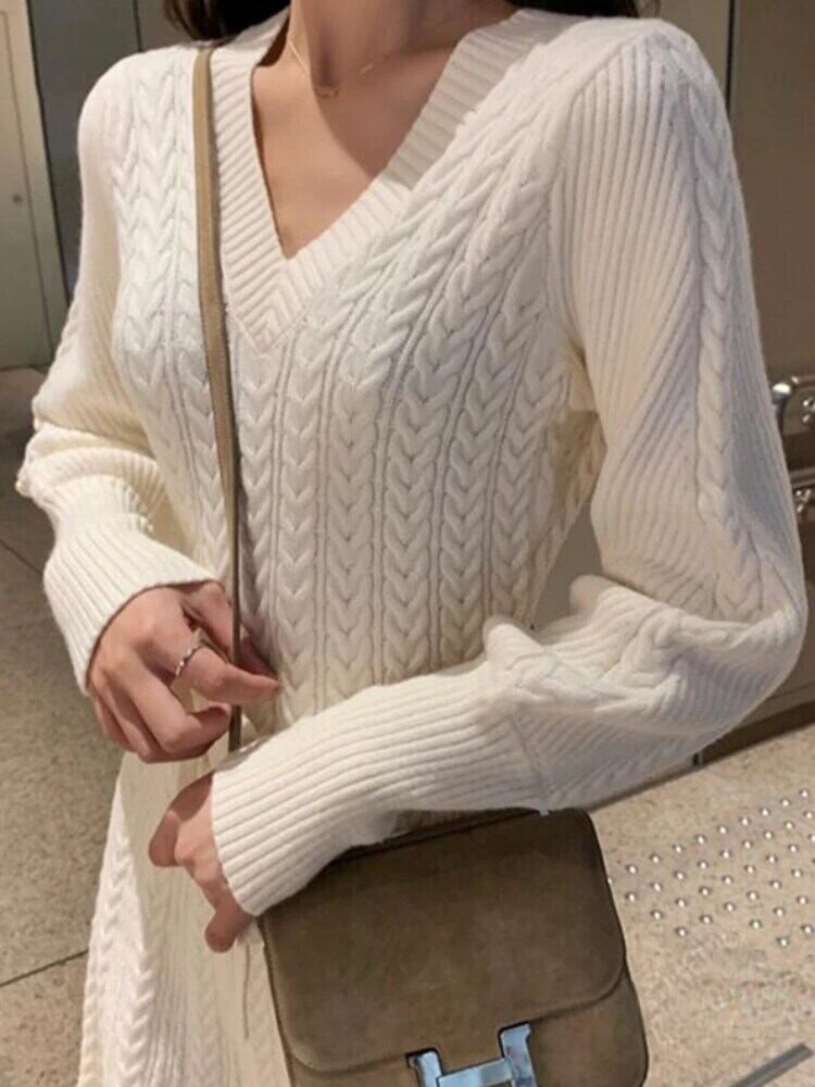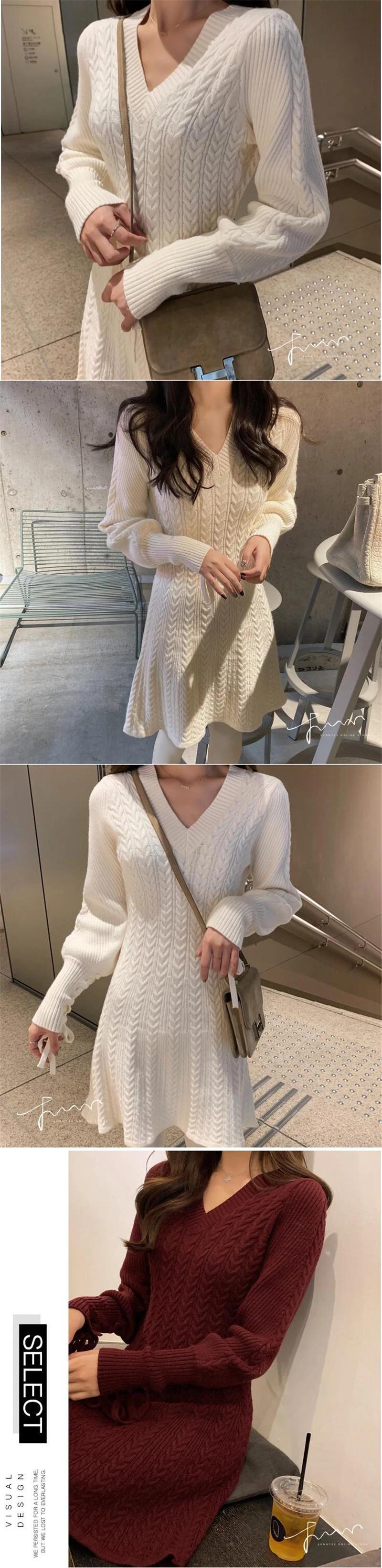 送料無料 レースアップランタンスリーブ A ラインニットドレス気質 V ネックツイストパターンニットセータードレス女性秋冬 2022 オータム 秋物 ウィンター 冬物 Vネック Aライン AE008878745150946226