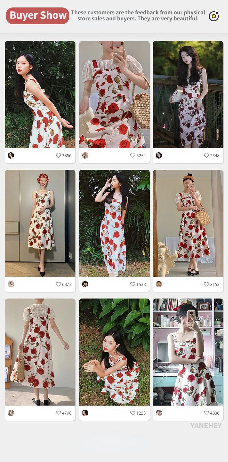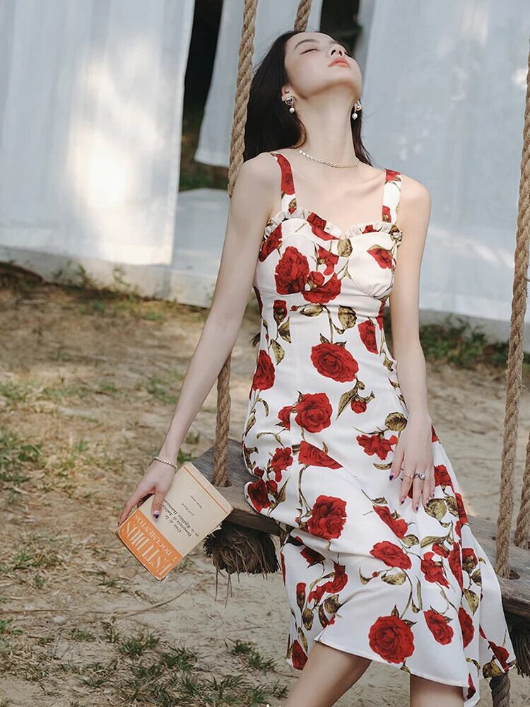 送料無料 女性の夏の花柄ローズストラップミディドレスノースリーブビーチパーティーサンドレス A ライン Vestidos サマー 夏物 Aライン AE008878725240555117