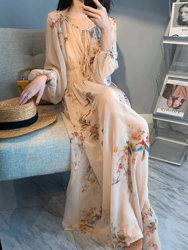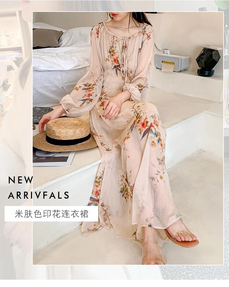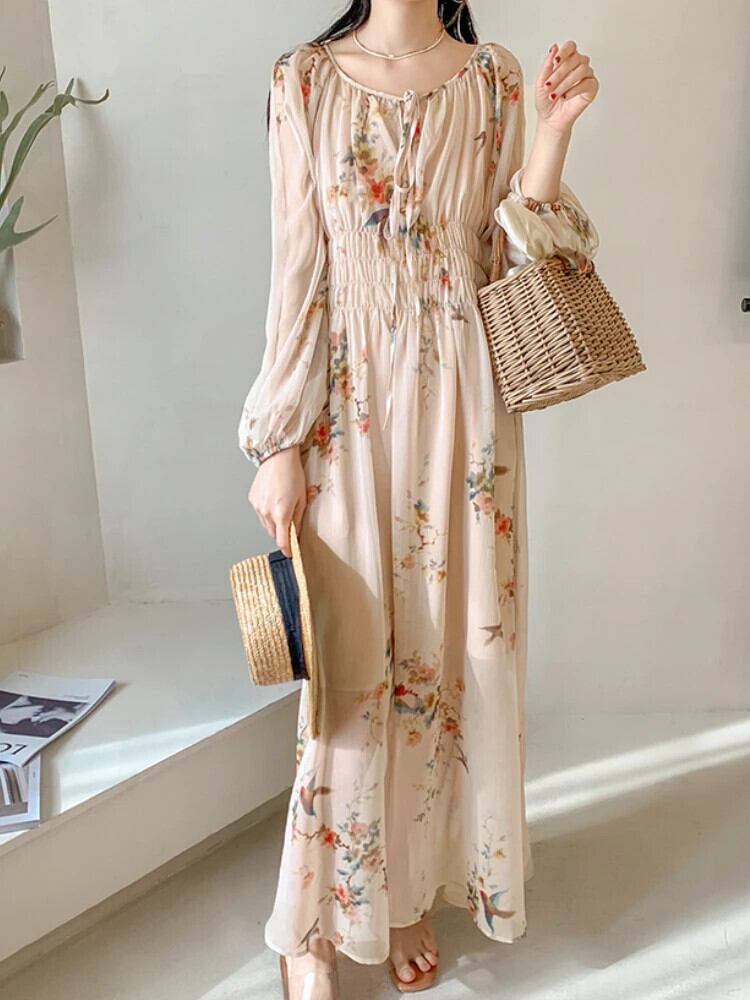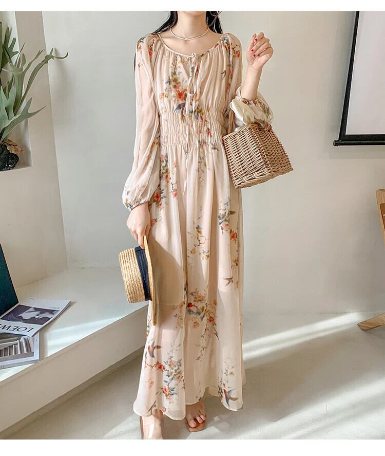 送料無料 ヴィンテージ花柄プリントプリーツウエスト長袖ビーチパーティーマキシドレスエスニックシフォンドレス女性夏 2022 ロング サマー 夏物 ビンテージ AE008878772223305809