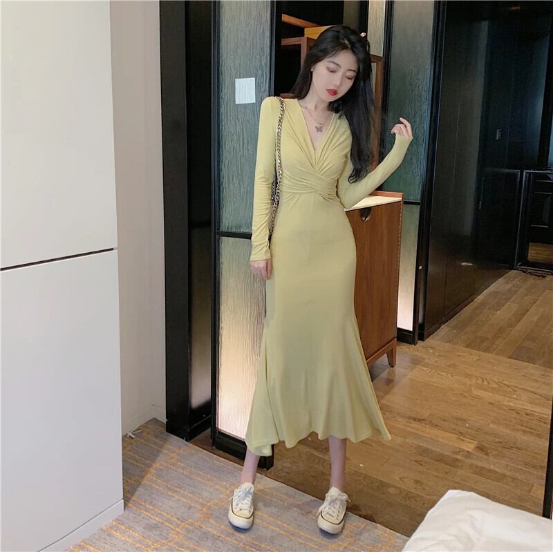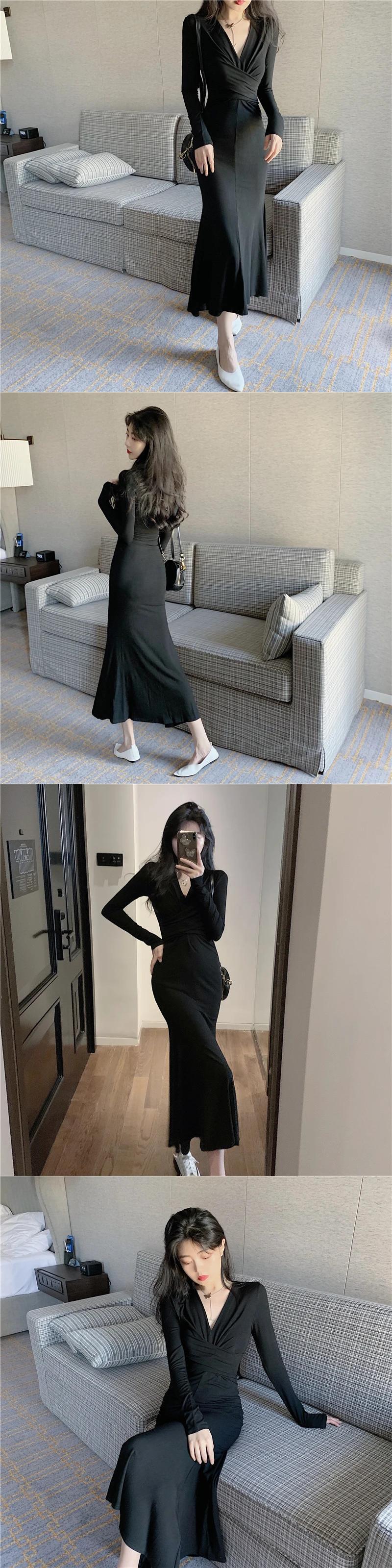送料無料 黒のセクシーなミディドレス女性オフィスレディ V ネックドレスイブニングパーティーワンピースドレス秋 2023 ブラック オータム 秋物 Vネック 会社 学校 通勤や通学にも AE008878757239072696